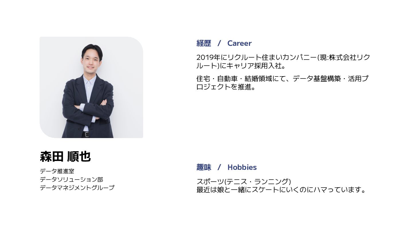 森田 順也 スポーツ(テニス・ランニング) 最近は娘と一緒にスケートにいくのにハマっています。 経歴 / Career 2019年にリクルート住まいカンパニー(現:株式会社リク ルート)にキャリア採用入社。 住宅・自動車・結婚領域にて、データ基盤構築・活用プ