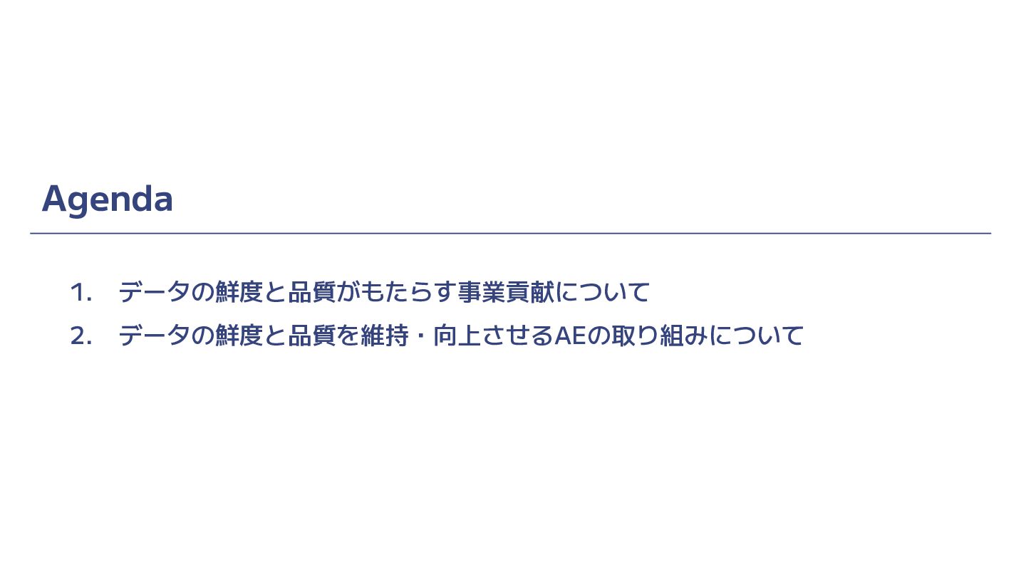 Agenda 1. データの鮮度と品質がもたらす事業貢献について 2. データの鮮度と品質を維持・向上させるAEの取り組みについて