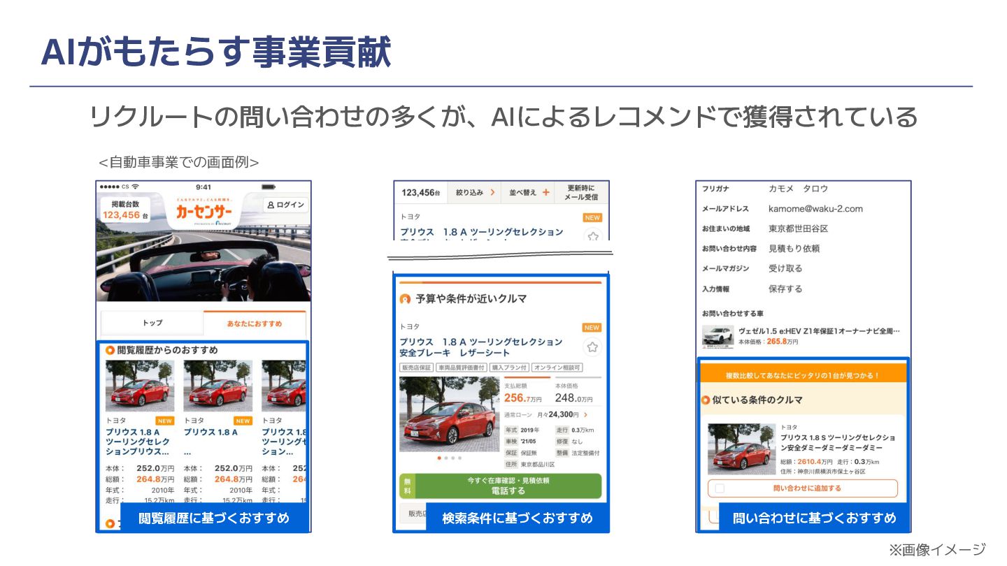 AIがもたらす事業貢献 リクルートの問い合わせの多くが、AIによるレコメンドで獲得されている 閲覧履歴に基づ いたレコメンド <自動車事業での画面例> 閲覧履歴に基づくおすすめ 検索条件に基づくおすすめ 問い合わせに基づくおすすめ ※画像イメージ