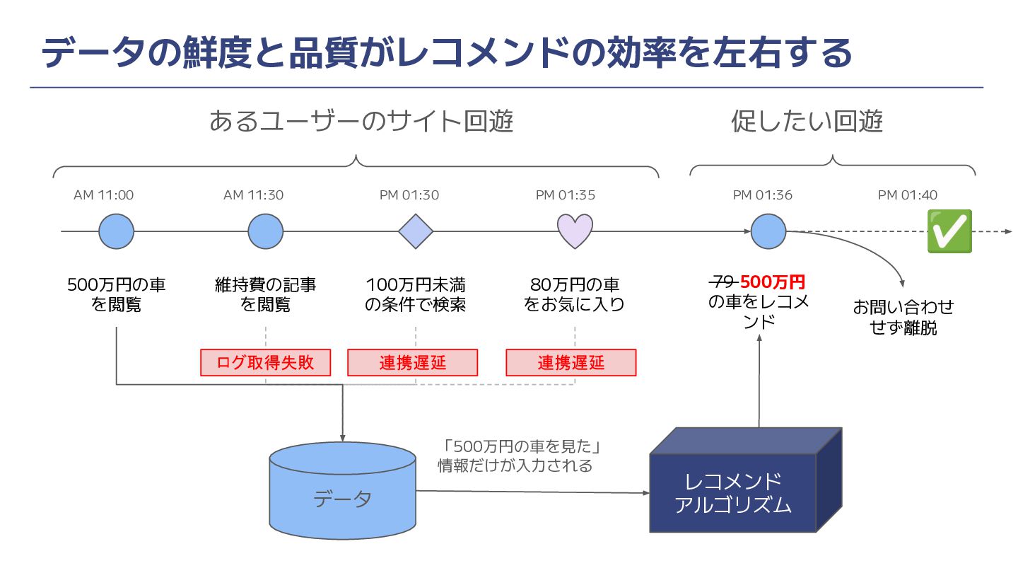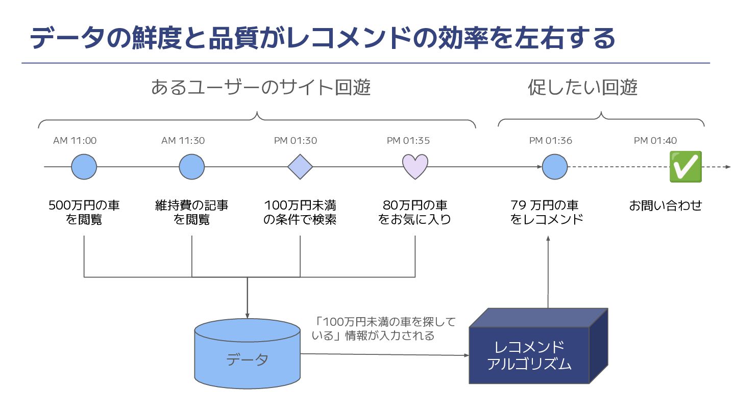 データの鮮度と品質がレコメンドの効率を左右する レコメンド アルゴリズム 500万円の車 を閲覧 維持費の記事 を閲覧 100万円未満 の条件で検索 80万円の車