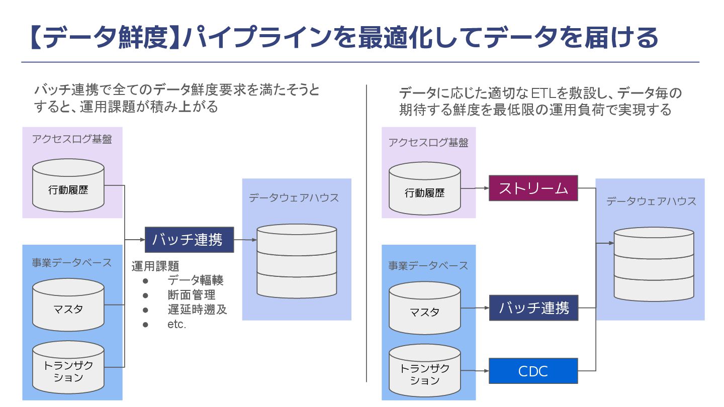 • データ輻輳 • 断面管理 • 遅延時遡及 • etc. バッチ連携で全てのデータ鮮度要求を満たそうと すると、運用課題が積み上がる 行動履歴 マスタ トランザク ション ストリーム アクセスログ基盤 事業データベース データウェアハウス データに応じた適切な ETLを敷設し、データ毎の 期待する鮮度を最低限の運用負荷で実現する バッチ連携 CDC