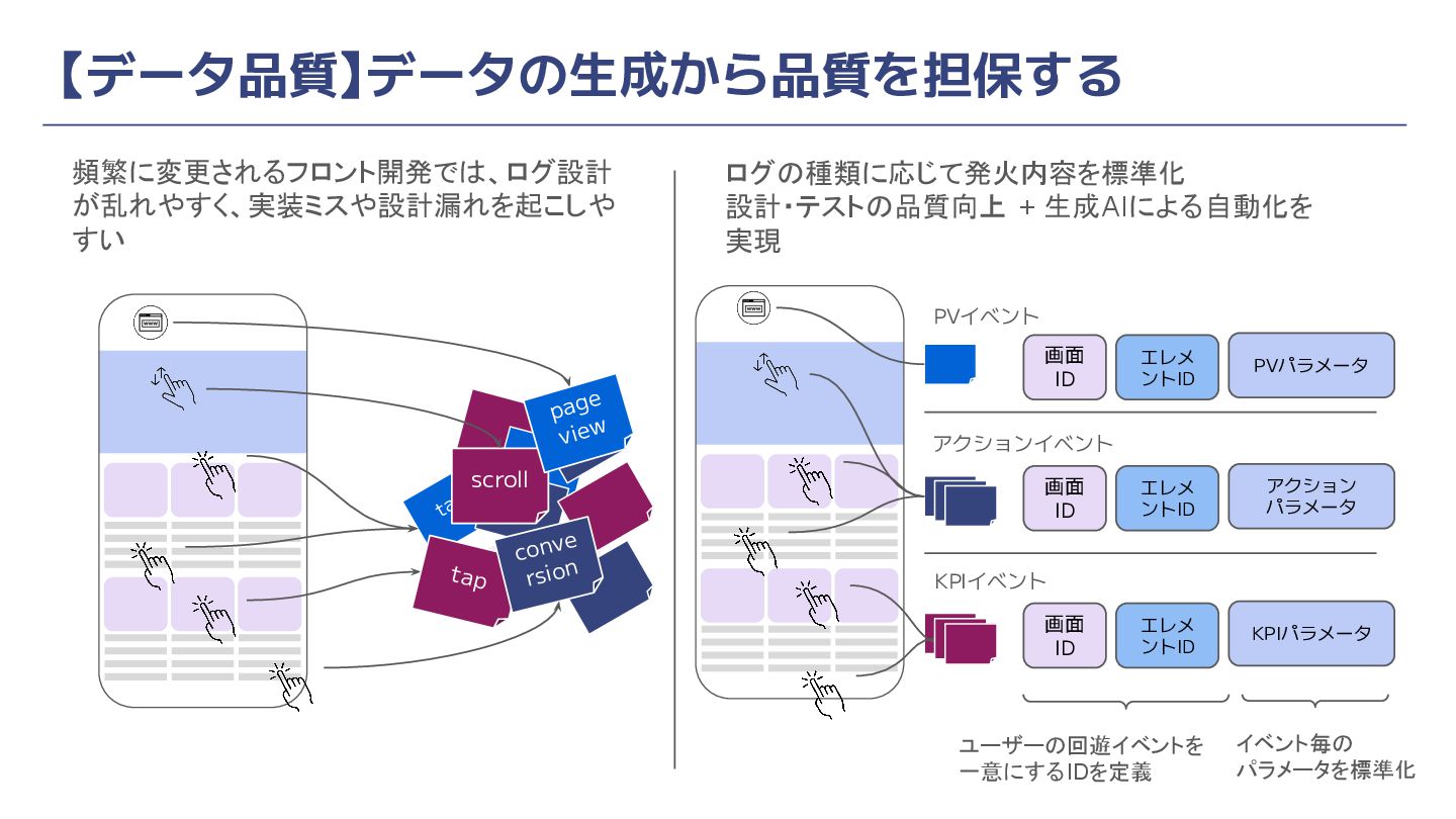 【データ品質】データの生成から品質を担保する tap scroll tap conve rsion page view 頻繁に変更されるフロント開発では、ログ設計 が乱れやすく、実装ミスや設計漏れを起こしや