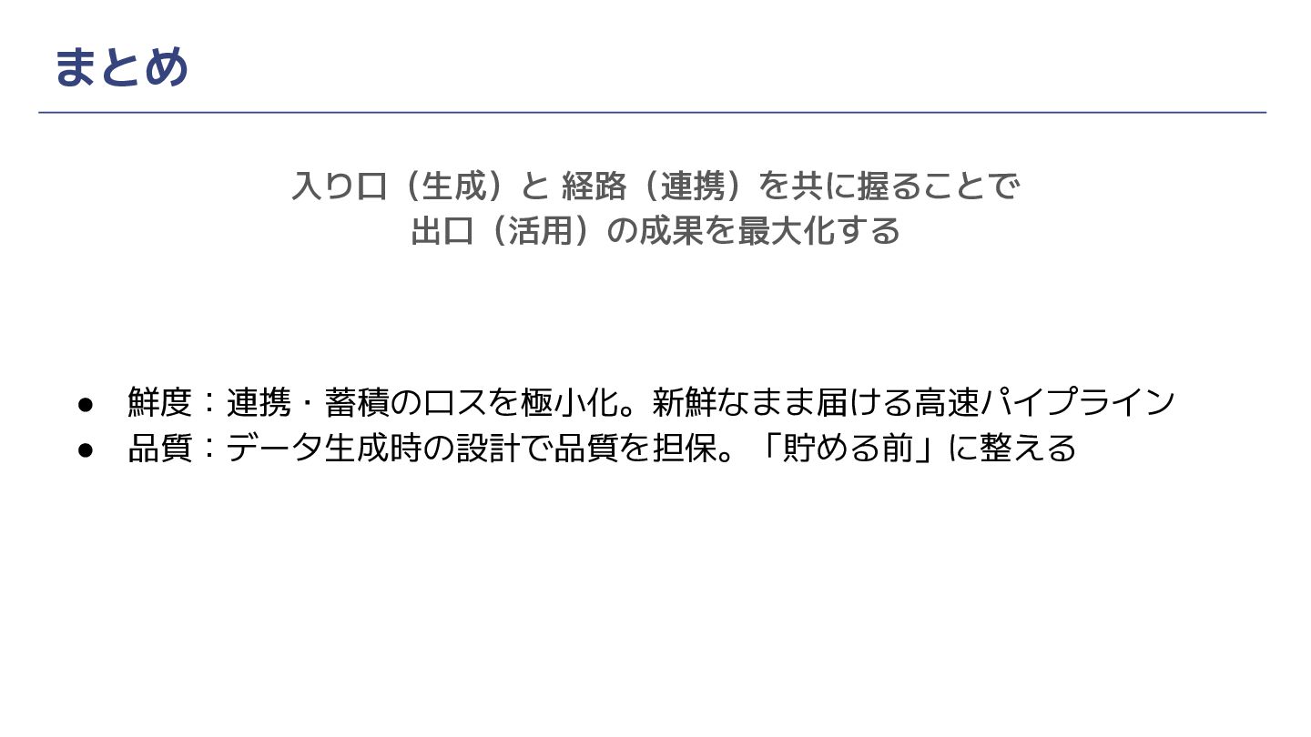 まとめ 入り口(生成)と 経路(連携)を共に握ることで 出口(活用)の成果を最大化する • 鮮度:連携・蓄積のロスを極小化。新鮮なまま届ける高速パイプライン • 品質:データ生成時の設計で品質を担保。「貯める前」に整える