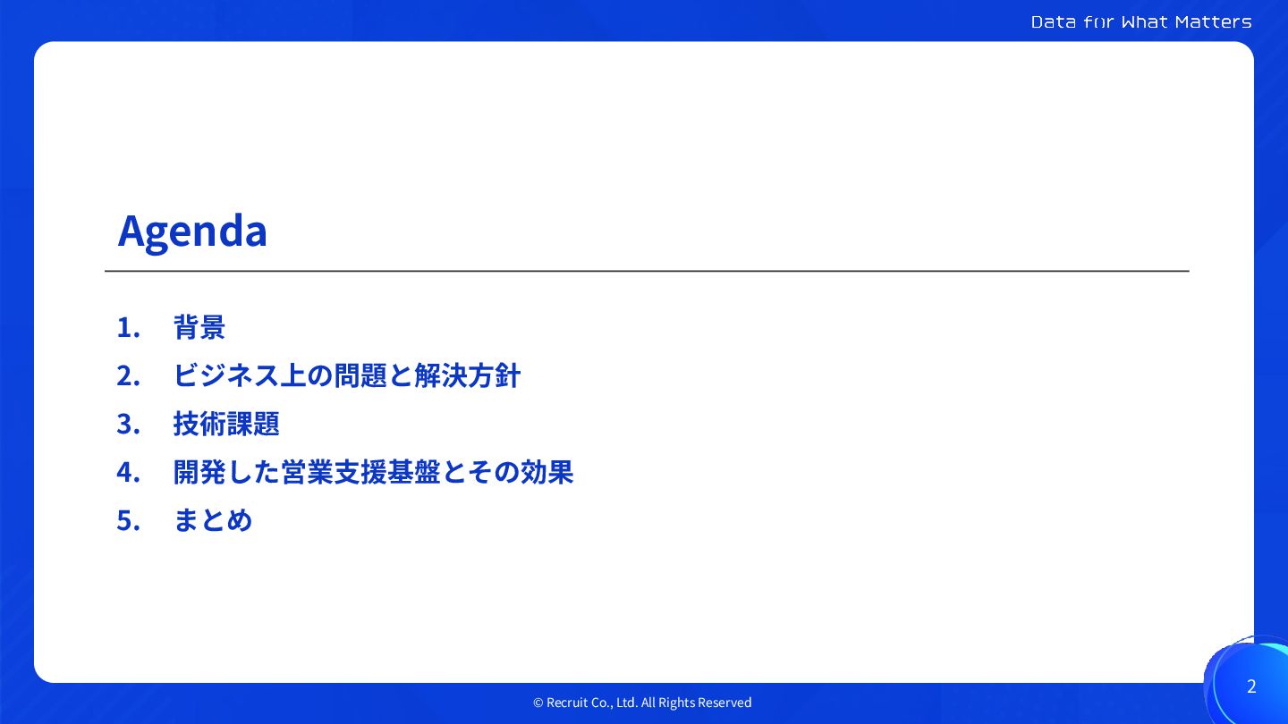 2. ビジネス上の問題と解決⽅針 3. 技術課題 4. 開発した営業⽀援基盤とその効果 5. まとめ 2