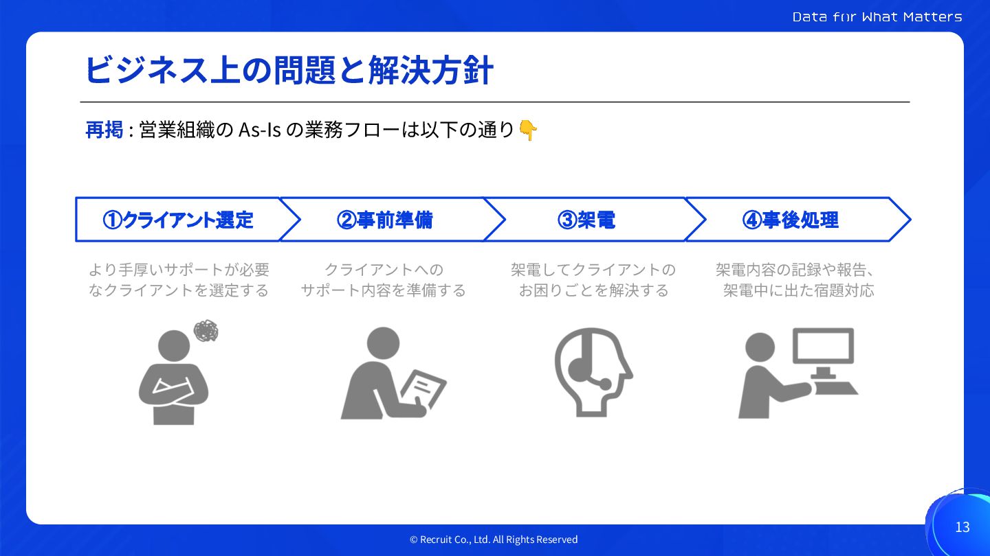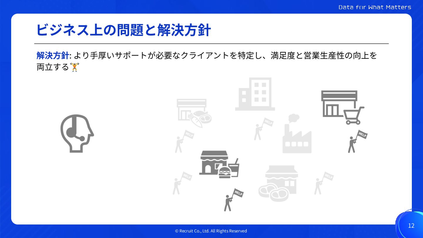 © Recruit Co., Ltd. All Rights Reserved ビジネス上の問題と解決⽅針 12 解決⽅針: