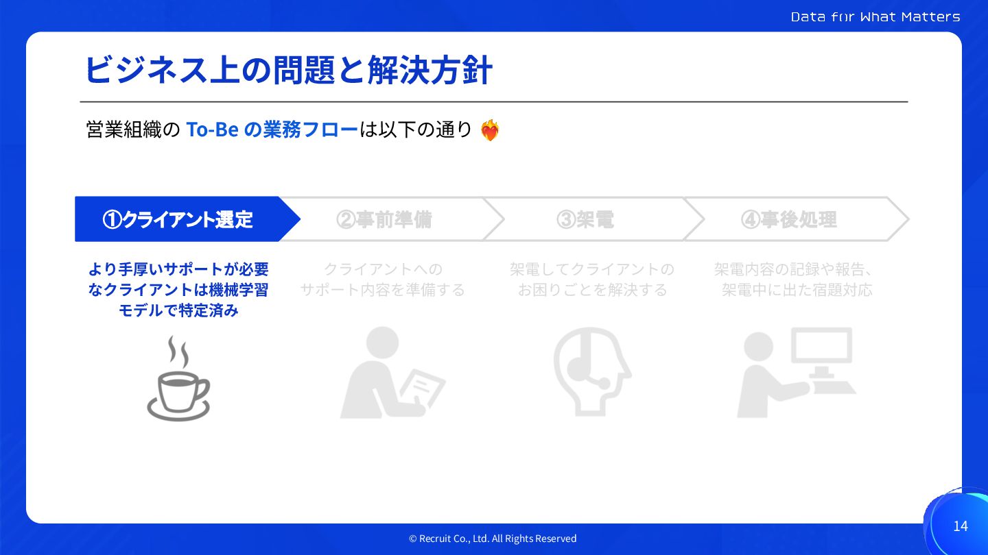 To-Be の業務フローは以下の通り より⼿厚いサポートが必要 なクライアントは機械学習 モデルで特定済み ④事後処理 ③架電 ②事前準備 ①クライアント選定 クライアントへの サポート内容を準備する 架電してクライアントの お困りごとを解決する 架電内容の記録や報告、 架電中に出た宿題対応