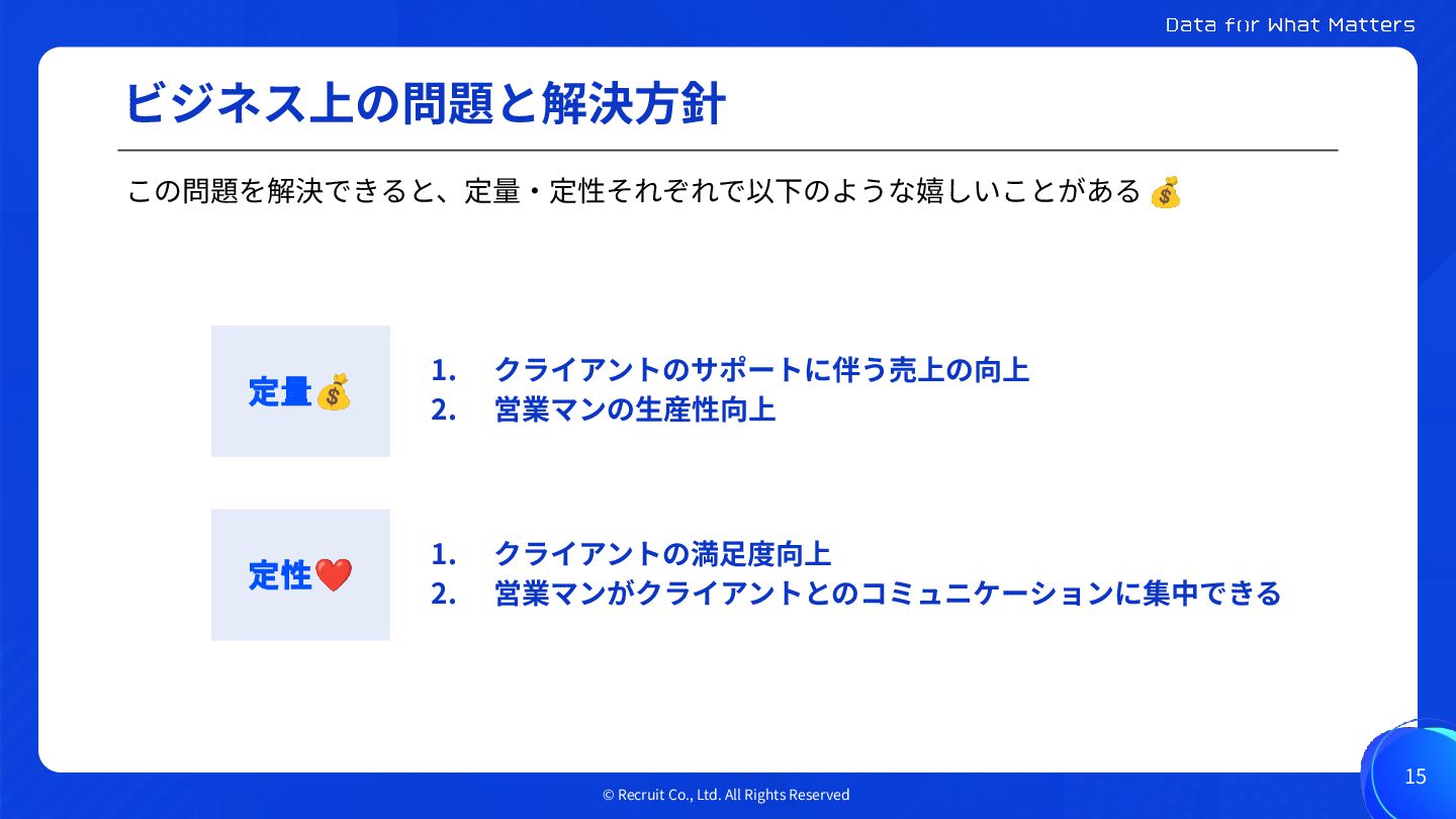 © Recruit Co., Ltd. All Rights Reserved ビジネス上の問題と解決⽅針 15 この問題を解決できると、定量‧定性それぞれで以下のような嬉しいことがある