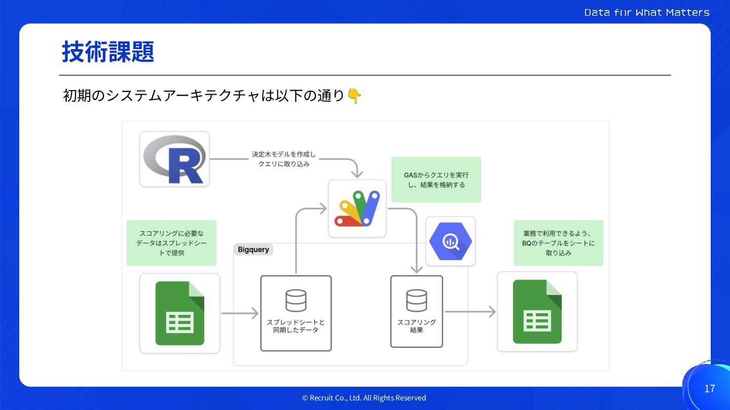 © Recruit Co., Ltd. All Rights Reserved 技術課題 17 初期のシステムアーキテクチャは以下の通り👇