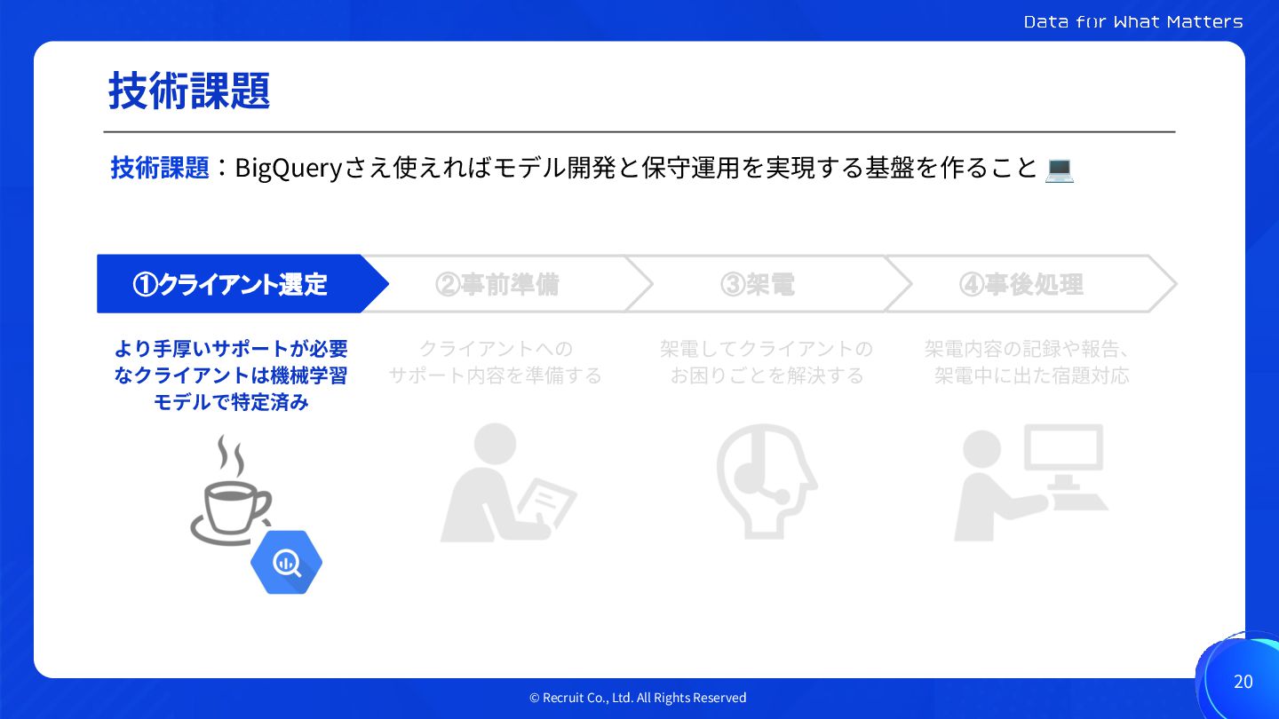 💻 より⼿厚いサポートが必要 なクライアントは機械学習 モデルで特定済み ④事後処理 ③架電 ②事前準備 ①クライアント選定 クライアントへの サポート内容を準備する 架電してクライアントの お困りごとを解決する 架電内容の記録や報告、 架電中に出た宿題対応