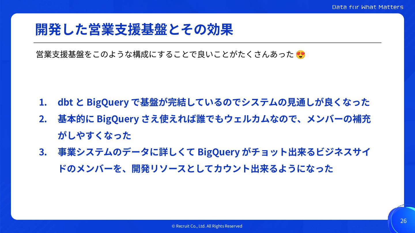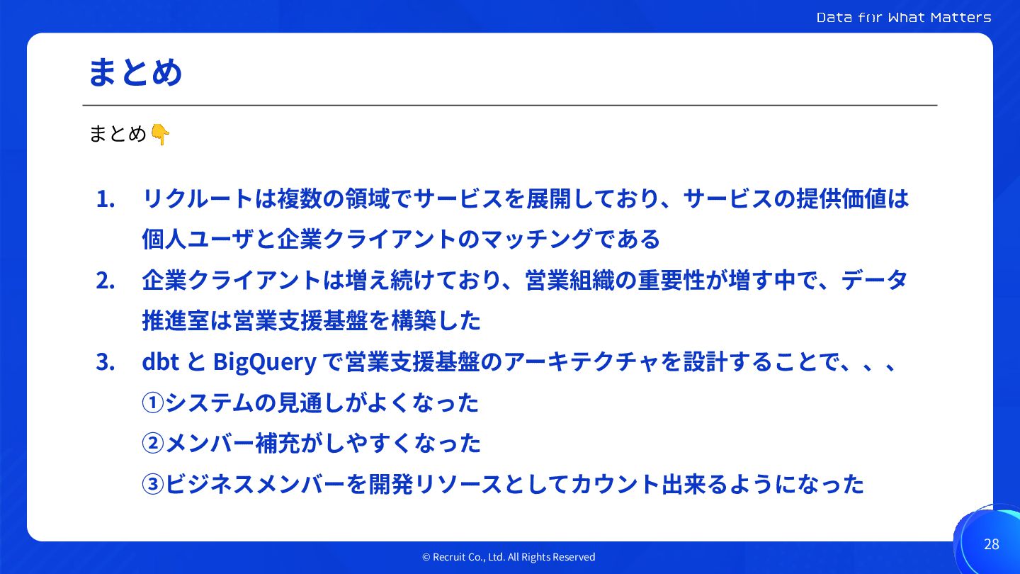 1. リクルートは複数の領域でサービスを展開しており、サービスの提供価値は 個⼈ユーザと企業クライアントのマッチングである 2. 企業クライアントは増え続けており、営業組織の重要性が増す中で、データ 推進室は営業⽀援基盤を構築した 3. dbt と BigQuery で営業⽀援基盤のアーキテクチャを設計することで、、、 ①システムの⾒通しがよくなった ②メンバー補充がしやすくなった ③ビジネスメンバーを開発リソースとしてカウント出来るようになった