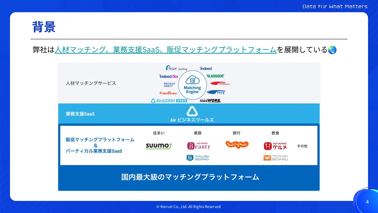 © Recruit Co., Ltd. All Rights Reserved 背景 4 弊社は⼈材マッチング、業務⽀援SaaS、販促マッチングプラットフォームを展開している🌏