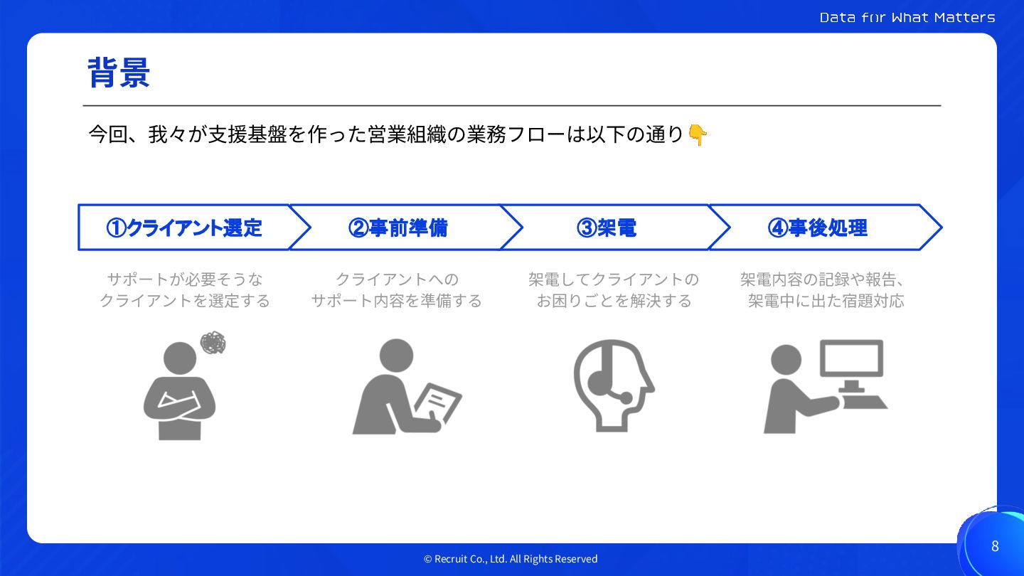 © Recruit Co., Ltd. All Rights Reserved 背景 8 今回、我々が⽀援基盤を作った営業組織の業務フローは以下の通り👇