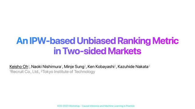 Practice An IPW-based Unbiased Ranking Metric in Two-sided Markets Keisho Oh1, Naoki Nishimura1, Minje Sung2, Ken Kobayashi2, Kazuhide Nakata2 1Recruit Co., Ltd., 2Tokyo Institute of Technology