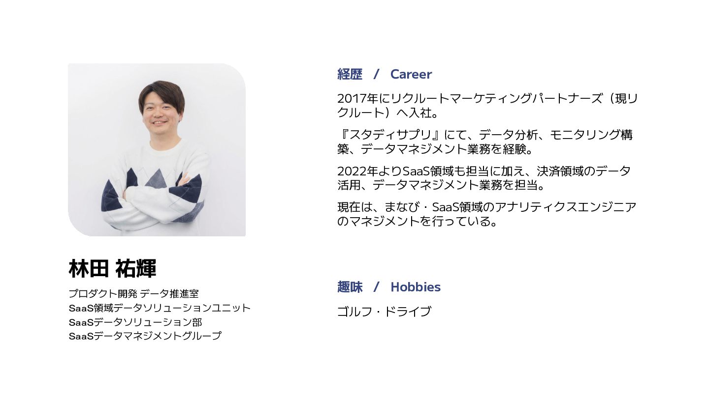 データ推進室 SaaS領域データソリューションユニット SaaSデータソリューション部 SaaSデータマネジメントグループ 2017年にリクルートマーケティングパートナーズ(現リ クルート)へ入社。 『スタディサプリ』にて、データ分析、モニタリング構 築、データマネジメント業務を経験。 2022年よりSaaS領域も担当に加え、決済領域のデータ 活用、データマネジメント業務を担当。 現在は、まなび・SaaS領域のアナリティクスエンジニア のマネジメントを行っている。