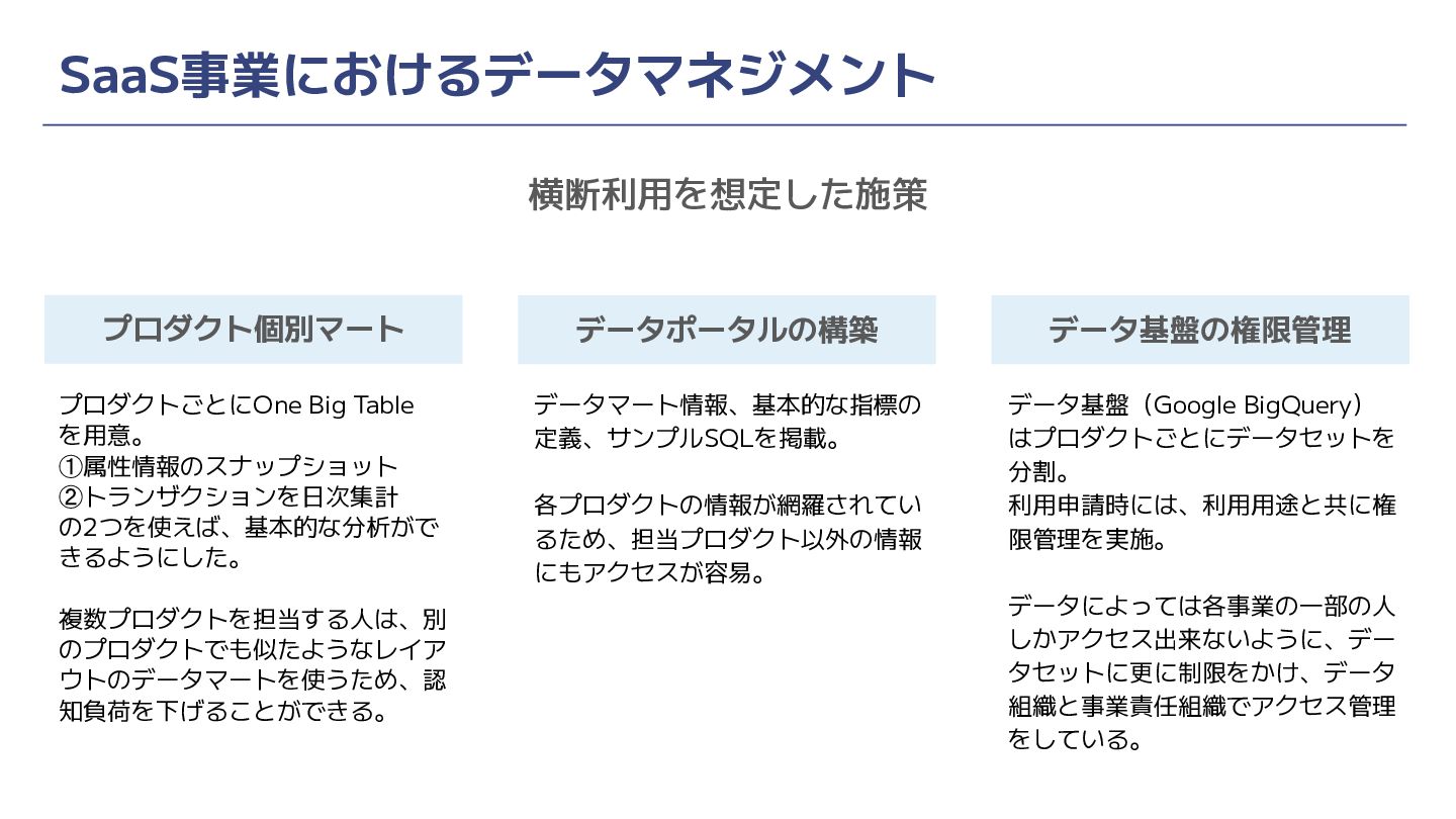 ウトのデータマートを使うため、認 知負荷を下げることができる。 SaaS事業におけるデータマネジメント 横断利用を想定した施策 プロダクト個別マート データポータルの構築 データ基盤の権限管理 データマート情報、基本的な指標の 定義、サンプルSQLを掲載。 各プロダクトの情報が網羅されてい るため、担当プロダクト以外の情報 にもアクセスが容易。 データ基盤(Google BigQuery) はプロダクトごとにデータセットを 分割。 利用申請時には、利用用途と共に権 限管理を実施。 データによっては各事業の一部の人 しかアクセス出来ないように、デー タセットに更に制限をかけ、データ 組織と事業責任組織でアクセス管理 をしている。