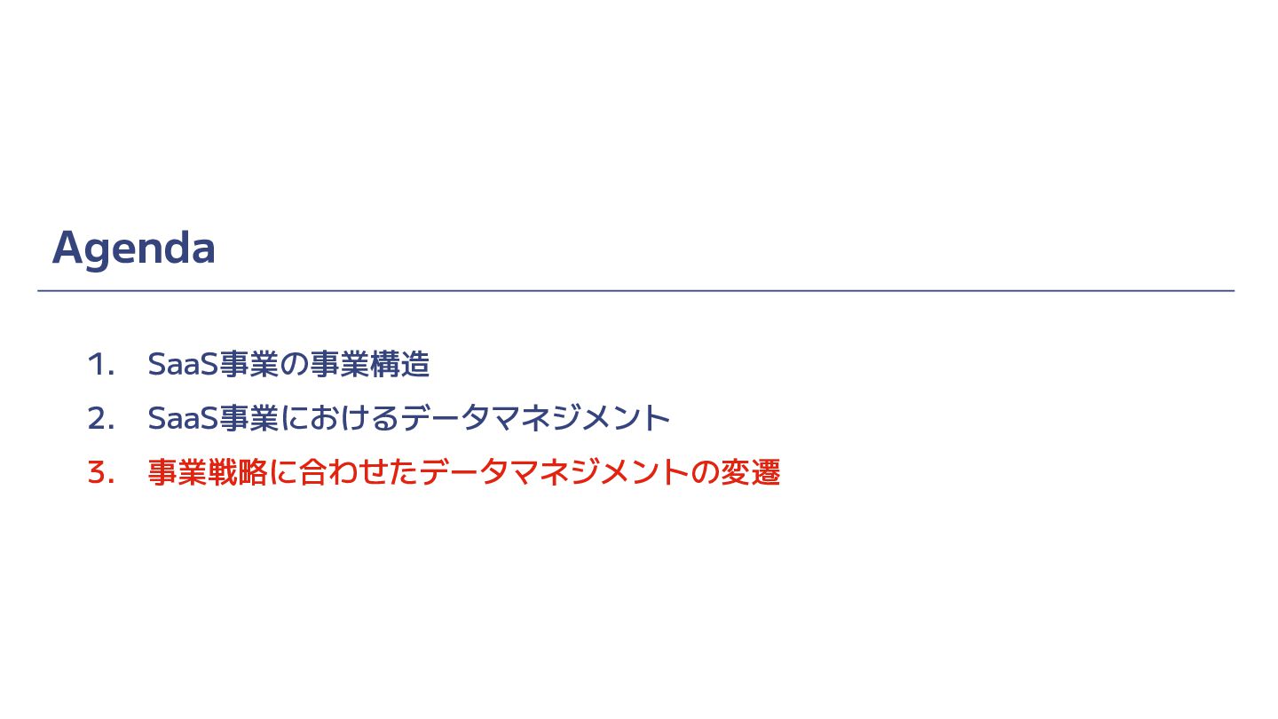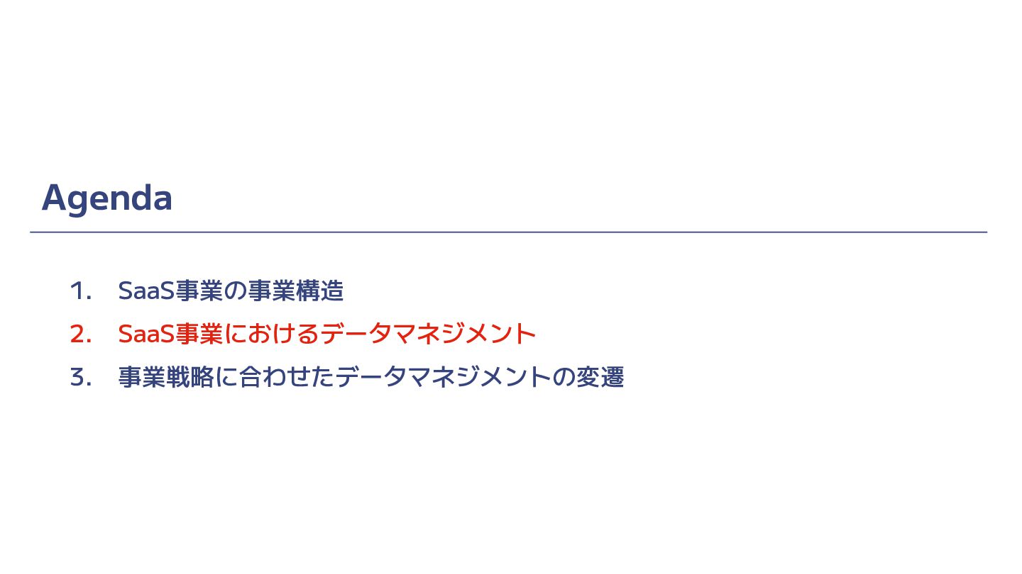 Agenda 1. SaaS事業の事業構造 2. SaaS事業におけるデータマネジメント 3. 事業戦略に合わせたデータマネジメントの変遷