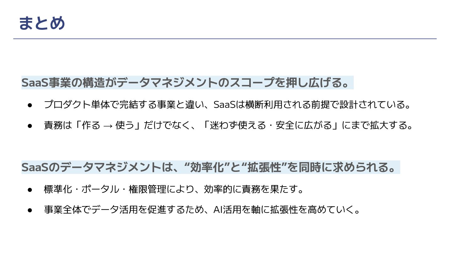 まとめ SaaS事業の構造がデータマネジメントのスコープを押し広げる。 • プロダクト単体で完結する事業と違い、SaaSは横断利用される前提で設計されている。 • 責務は「作る → 使う」だけでなく、「迷わず使える・安全に広がる」にまで拡大する。 SaaSのデータマネジメントは、“効率化”と“拡張性”を同時に求められる。 •