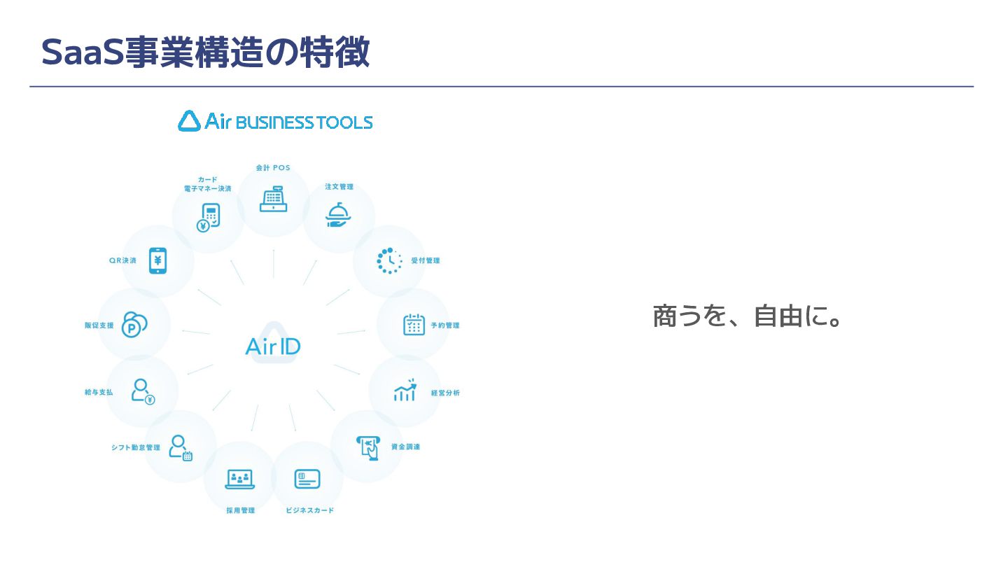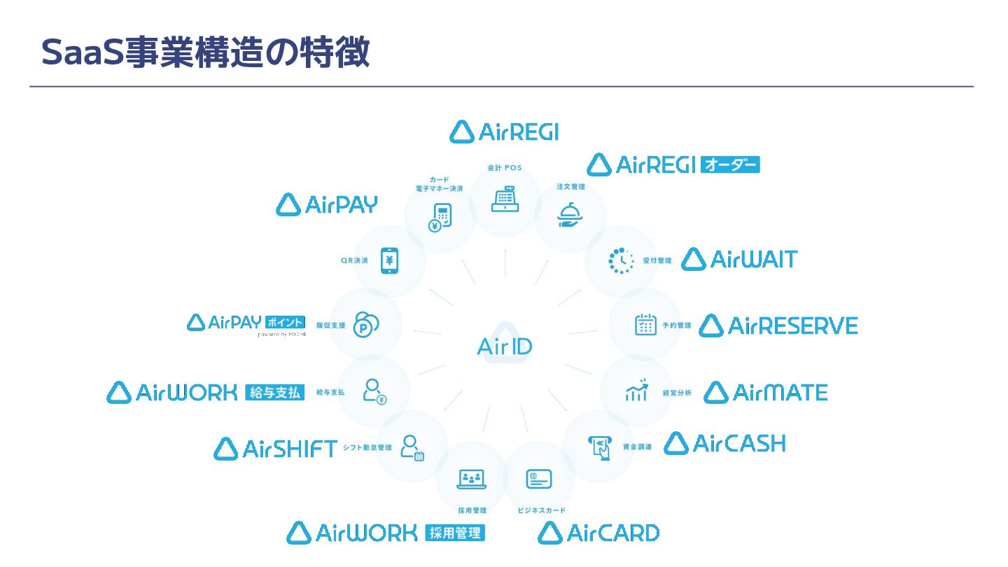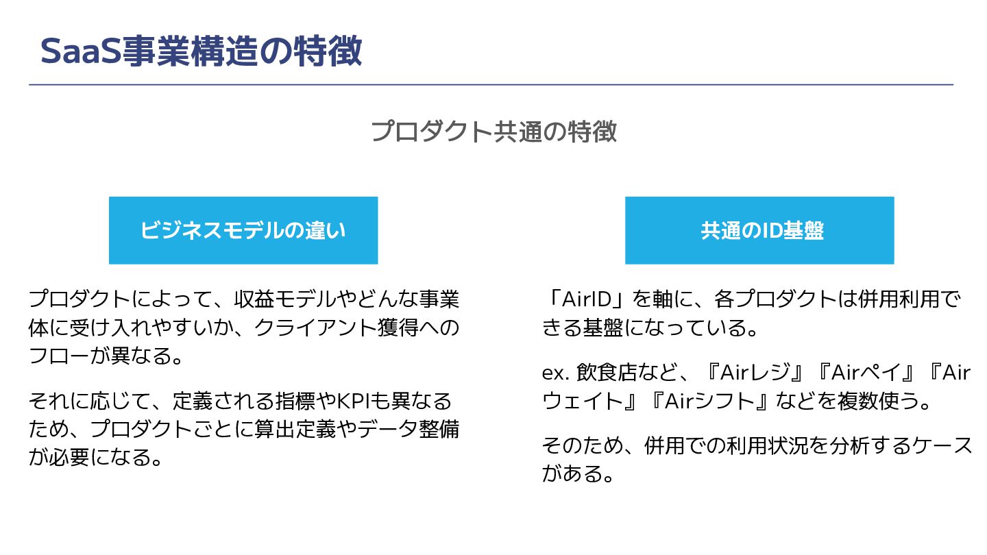 「AirID」を軸に、各プロダクトは併用利用で きる基盤になっている。 ex. 飲食店など、『Airレジ』『Airペイ』『Air ウェイト』『Airシフト』などを複数使う。 そのため、併用での利用状況を分析するケース がある。