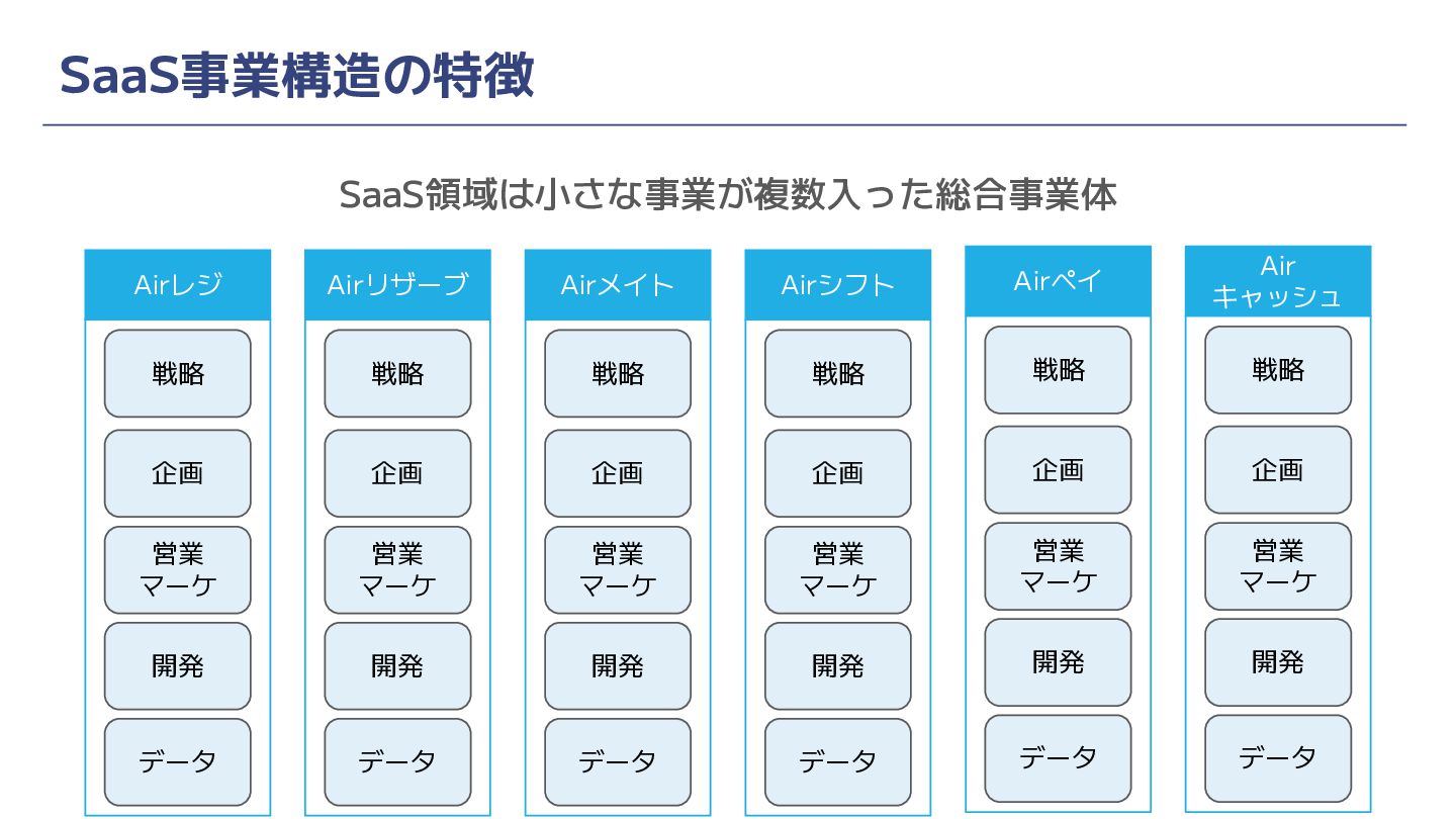 SaaS事業構造の特徴 SaaS領域は小さな事業が複数入った総合事業体 戦略 企画 営業 マーケ 開発 データ Airレジ 戦略
