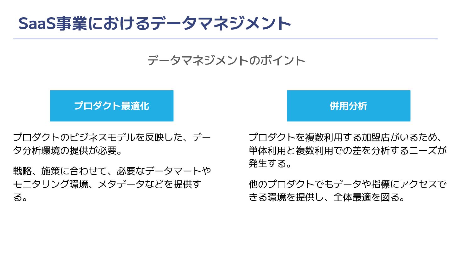 プロダクトのビジネスモデルを反映した、デー タ分析環境の提供が必要。 戦略、施策に合わせて、必要なデータマートや モニタリング環境、メタデータなどを提供す る。 併用分析 SaaS事業におけるデータマネジメント データマネジメントのポイント プロダクト最適化 プロダクトを複数利用する加盟店がいるため、