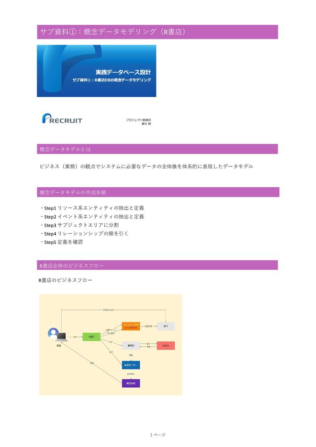 サブ資料①:概念データモデリング(R書店) 概念データモデルとは ビジネス(業務)の観点でシステムに必要なデータの全体像を体系的に表現したデータモデル R書店全体のビジネスフロー R書店のビジネスフロー 概念データモデルの作成手順 ・Step1 リソース系エンティティの抽出と定義 ・Step2 イベント系エンティティの抽出と定義