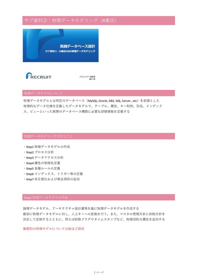 サブ資料③:物理データモデリング(R書店) 物理データモデルについて 物理データモデルとは特定のデータベース(MySQL, Oracle, DB2, SQL, Server…etc)を前提とした 物理的なデータ仕様を定義したデータモデルで、テーブル、属性、キー制約、別名、インデック ス、ビューといった実際のデータベース構築に必要な詳細情報を定義する ・Step1