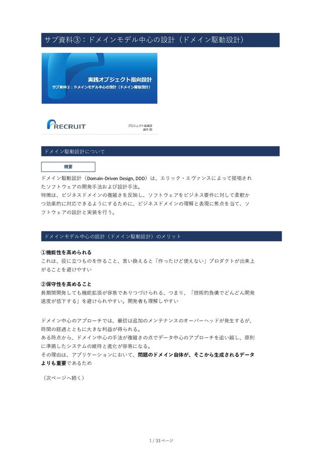 ドメインモデル中心の設計(ドメイン駆動設計)のメリット ①機能性を高められる これは、役に立つものを作ること、言い換えると「作ったけど使えない」プロダクトが出来上 がることを避けやすい ②保守性を高めること ⾧期間開発しても機能拡張が容易でありつづけられる、つまり、「技術的負債でどんどん開発 速度が低下する」を避けられやすい。開発者も理解しやすい ドメイン中心のアプローチでは、最初は追加のメンテナンスのオーバーヘッドが発生するが、 時間の経過とともに大きな利益が得られる。 ある時点から、ドメイン中心の手法が複雑さの点でデータ中心のアプローチを追い越し、原則 に準拠したシステムの維持と進化が容易になる。 その理由は、アプリケーションにおいて、問題のドメイン自体が、そこから生成されるデータ よりも重要であるため (次ページへ続く) 1 / 33 ページ