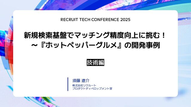 新規検索基盤でマッチング精度向上に挑む! ~『ホットペッパーグルメ』の開発事例 RECRUIT TECH CONFERENCE 2025 技術編 須藤 遼介 株式会社リクルート