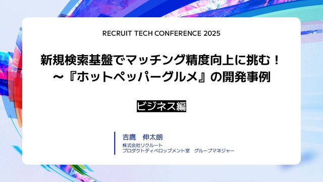 新規検索基盤でマッチング精度向上に挑む! ~『ホットペッパーグルメ』の開発事例 RECRUIT TECH CONFERENCE 2025 ビジネス編 吉鷹 伸太朗 株式会社リクルート プロダクトディベロップメント室 グループマネジャー