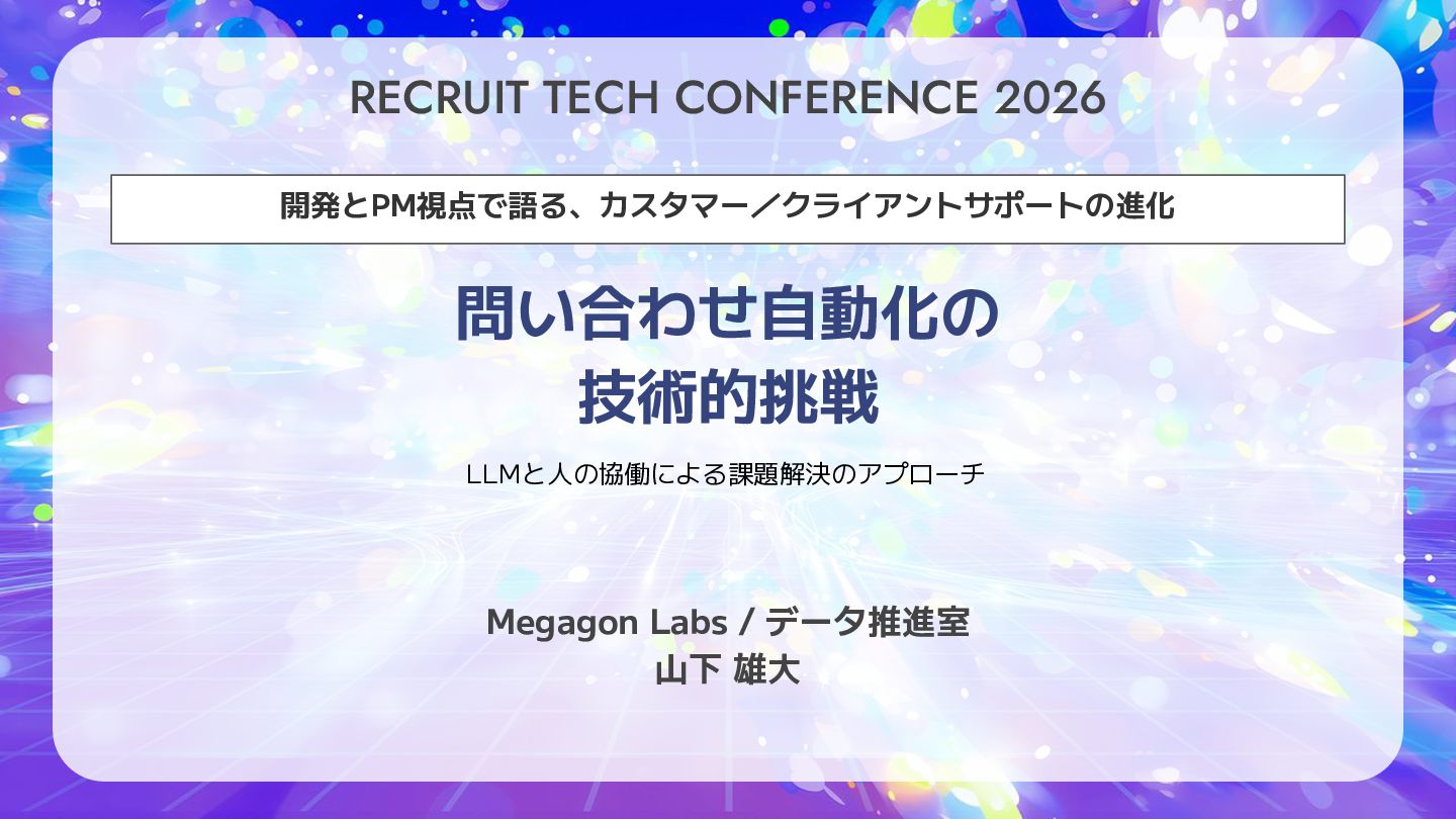 RECRUIT TECH CONFERENCE 2026 開発とPM視点で語る、カスタマー/クライアントサポートの進化 問い合わせ自動化の 技術的挑戦 LLMと人の協働による課題解決のアプローチ Megagon Labs
