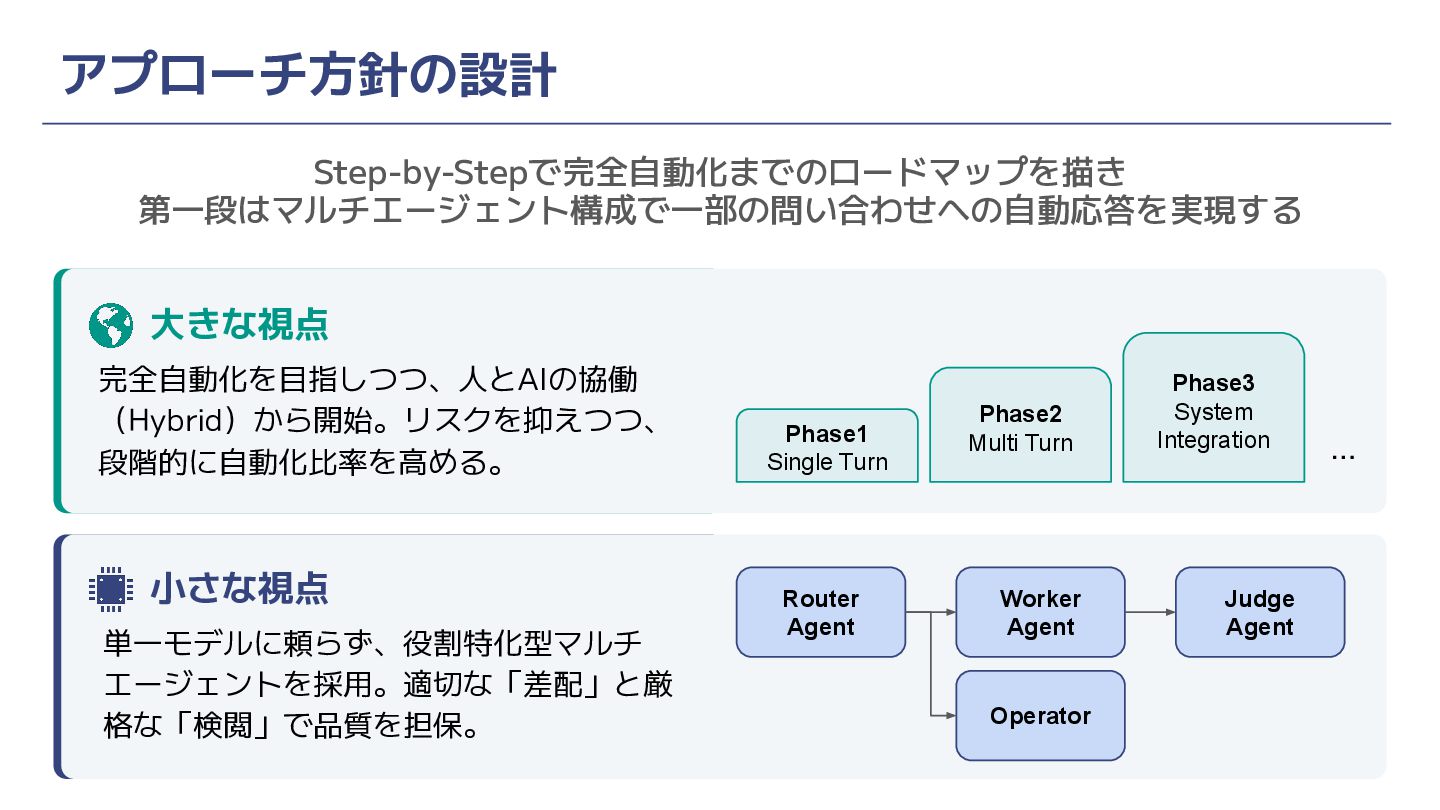 アプローチ方針の設計 Step-by-Stepで完全自動化までのロードマップを描き 第一段はマルチエージェント構成で一部の問い合わせへの自動応答を実現する 大きな視点 完全自動化を目指しつつ、人とAIの協働 (Hybrid)から開始。リスクを抑えつつ、 段階的に自動化比率を高める。 小さな視点 単一モデルに頼らず、役割特化型マルチ エージェントを採用。適切な「差配」と厳