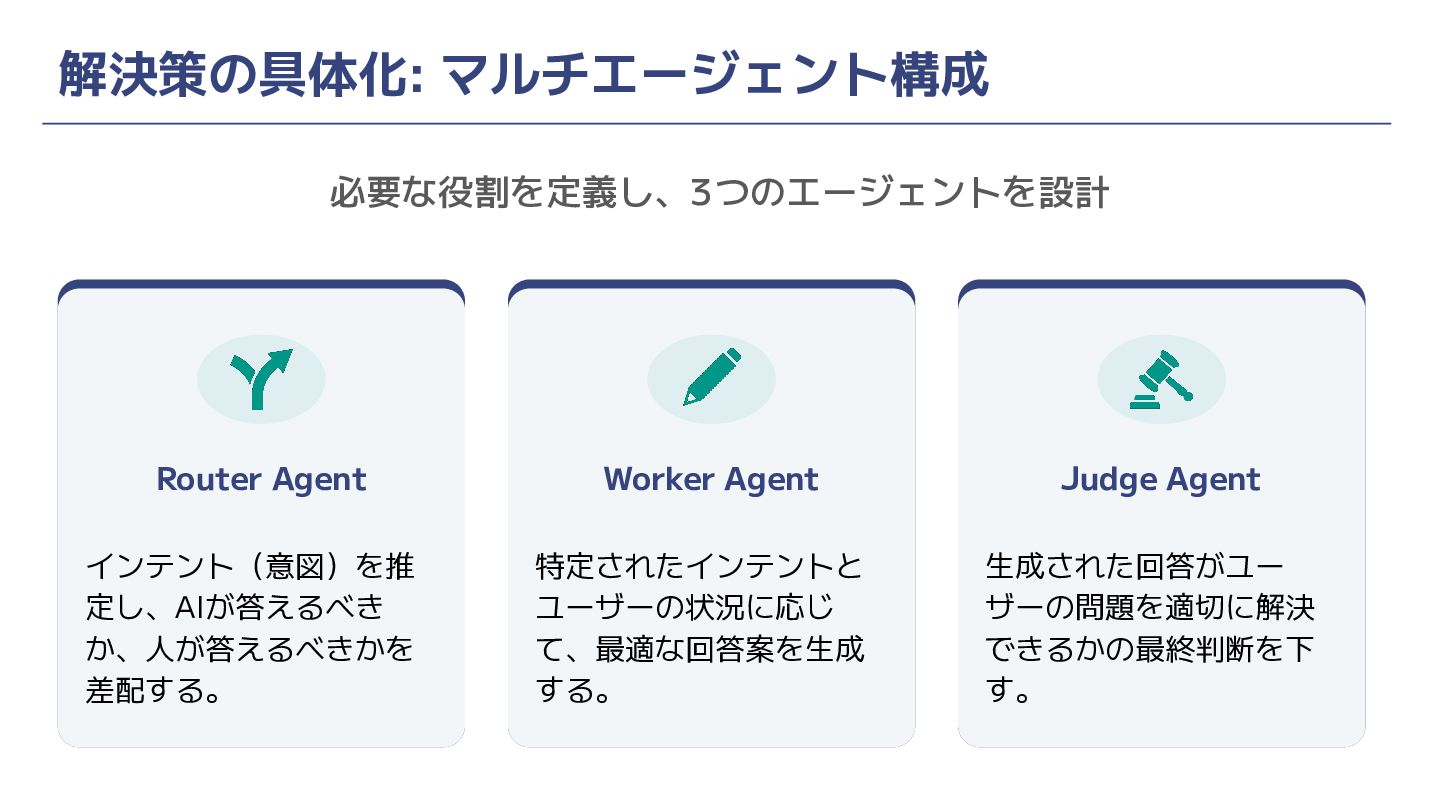 必要な役割を定義し、3つのエージェントを設計 解決策の具体化: マルチエージェント構成 … Router Agent インテント(意図)を推 定し、AIが答えるべき か、人が答えるべきかを 差配する。