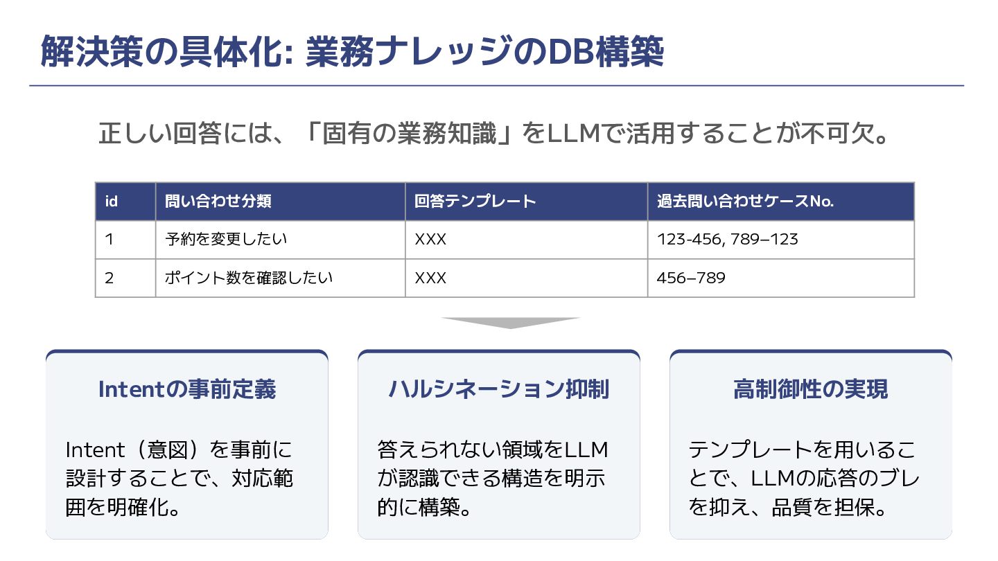 正しい回答には、「固有の業務知識」をLLMで活用することが不可欠。 解決策の具体化: 業務ナレッジのDB構築 id 問い合わせ分類 回答テンプレート 過去問い合わせケースNo. 1 予約を変更したい XXX