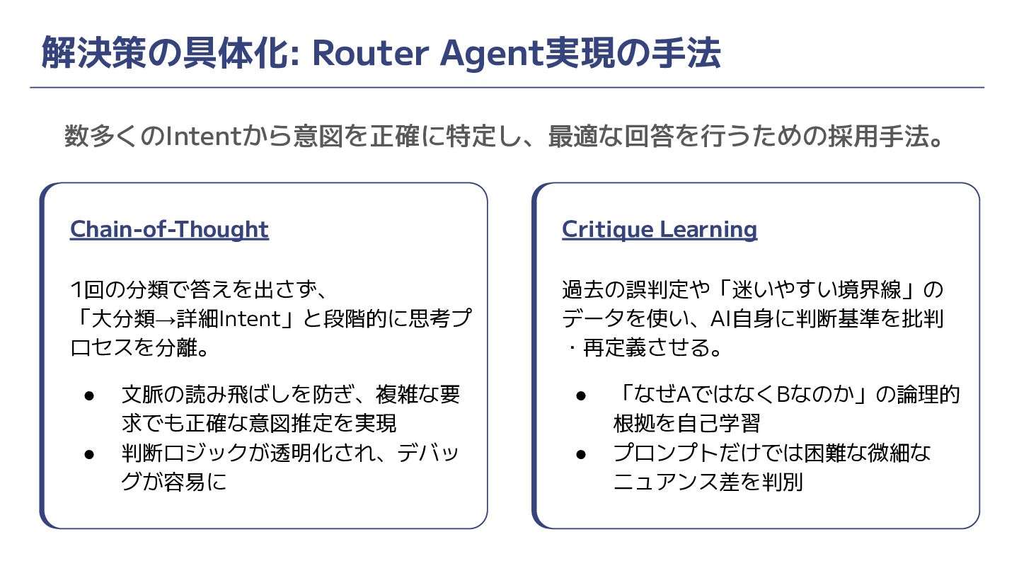 数多くのIntentから意図を正確に特定し、最適な回答を行うための採用手法。 解決策の具体化: Router Agent実現の手法 Chain-of-Thought 1回の分類で答えを出さず、 「大分類→詳細Intent」と段階的に思考プ ロセスを分離。 • 文脈の読み飛ばしを防ぎ、複雑な要
