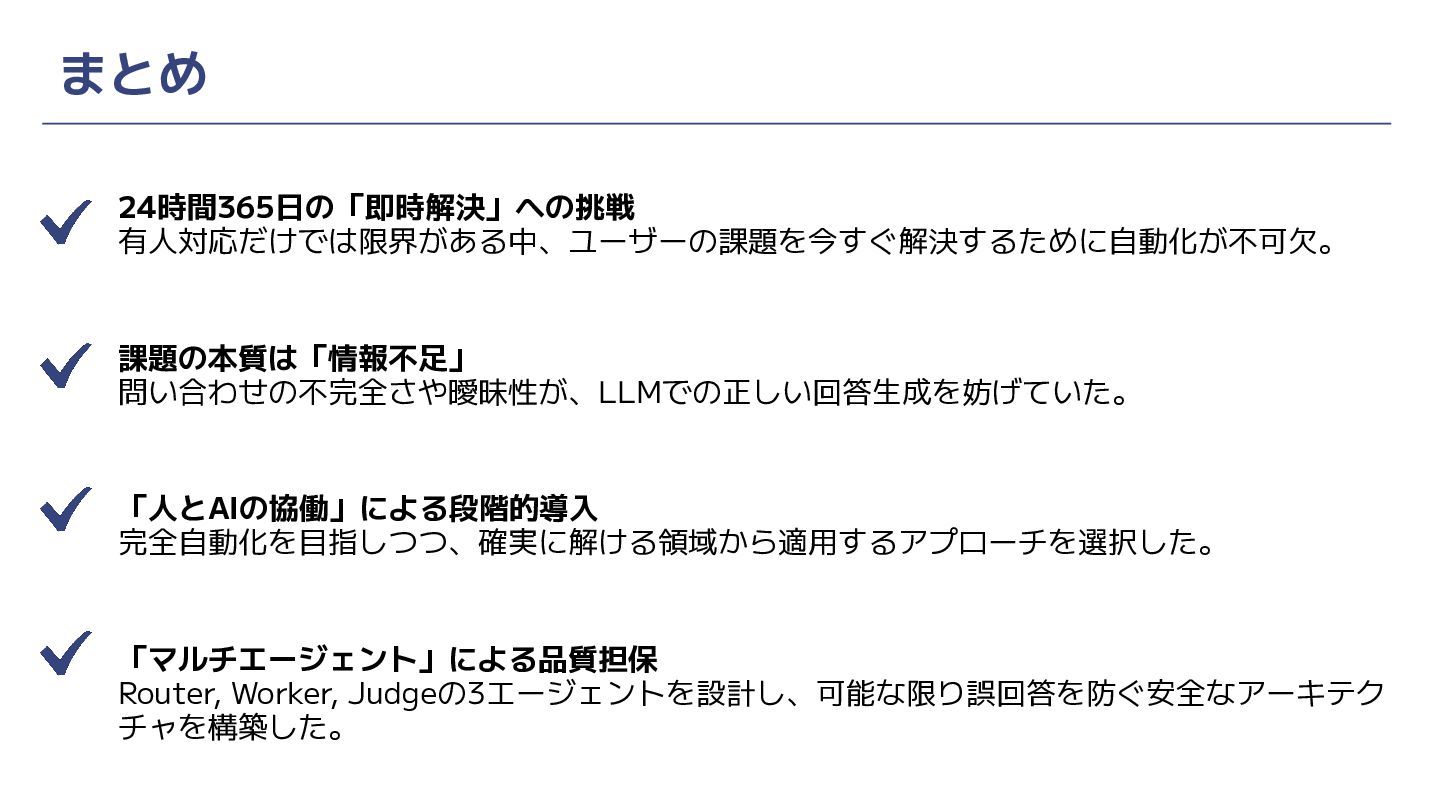 24時間365日の「即時解決」への挑戦 有人対応だけでは限界がある中、ユーザーの課題を今すぐ解決するために自動化が不可欠。 課題の本質は「情報不足」 問い合わせの不完全さや曖昧性が、LLMでの正しい回答生成を妨げていた。 「人とAIの協働」による段階的導入 完全自動化を目指しつつ、確実に解ける領域から適用するアプローチを選択した。 「マルチエージェント」による品質担保 Router, Worker, Judgeの3エージェントを設計し、可能な限り誤回答を防ぐ安全なアーキテク