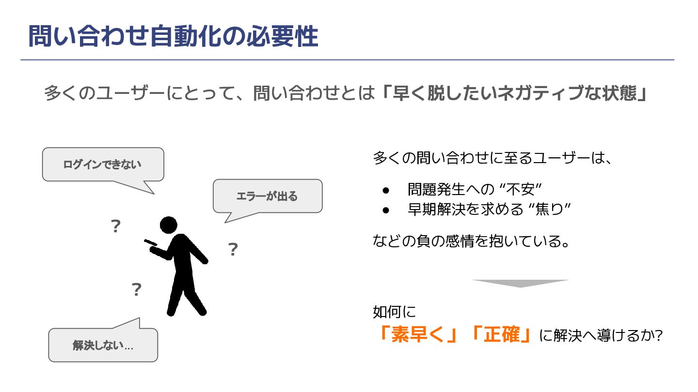 問い合わせ自動化の必要性 多くのユーザーにとって、問い合わせとは「早く脱したいネガティブな状態」 ? ? ? エラーが出る 解決しない... ログインできない