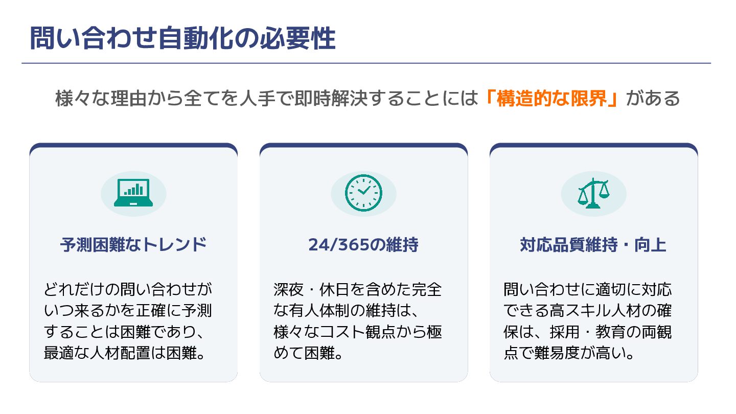 な有人体制の維持は、 様々なコスト観点から極 めて困難。 問い合わせに適切に対応 できる高スキル人材の確 保は、採用・教育の両観 点で難易度が高い。