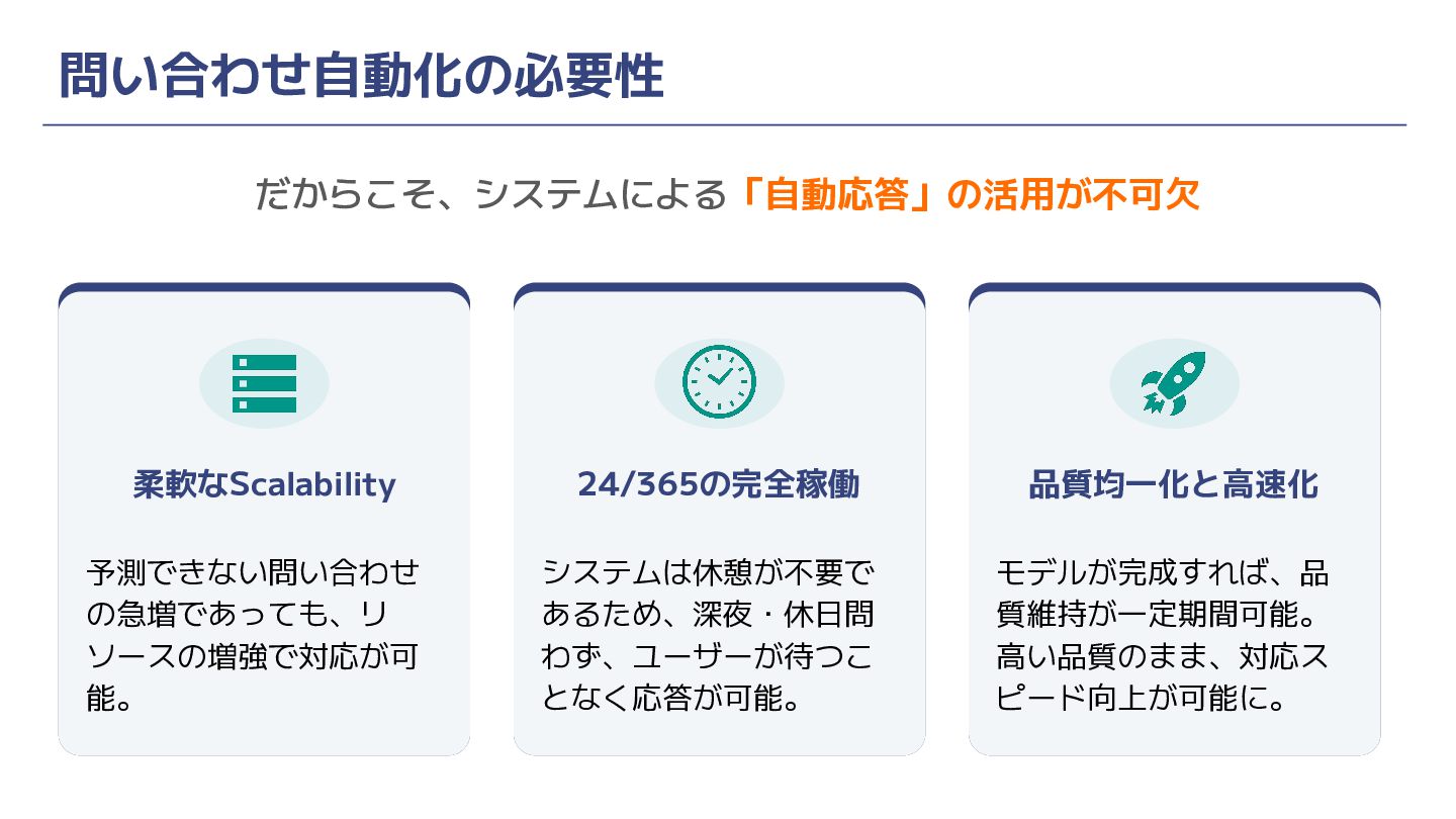 問い合わせ自動化の必要性 だからこそ、システムによる「自動応答」の活用が不可欠 柔軟なScalability 予測できない問い合わせ の急増であっても、リ ソースの増強で対応が可 能。 24/365の完全稼働 品質均一化と高速化 システムは休憩が不要で