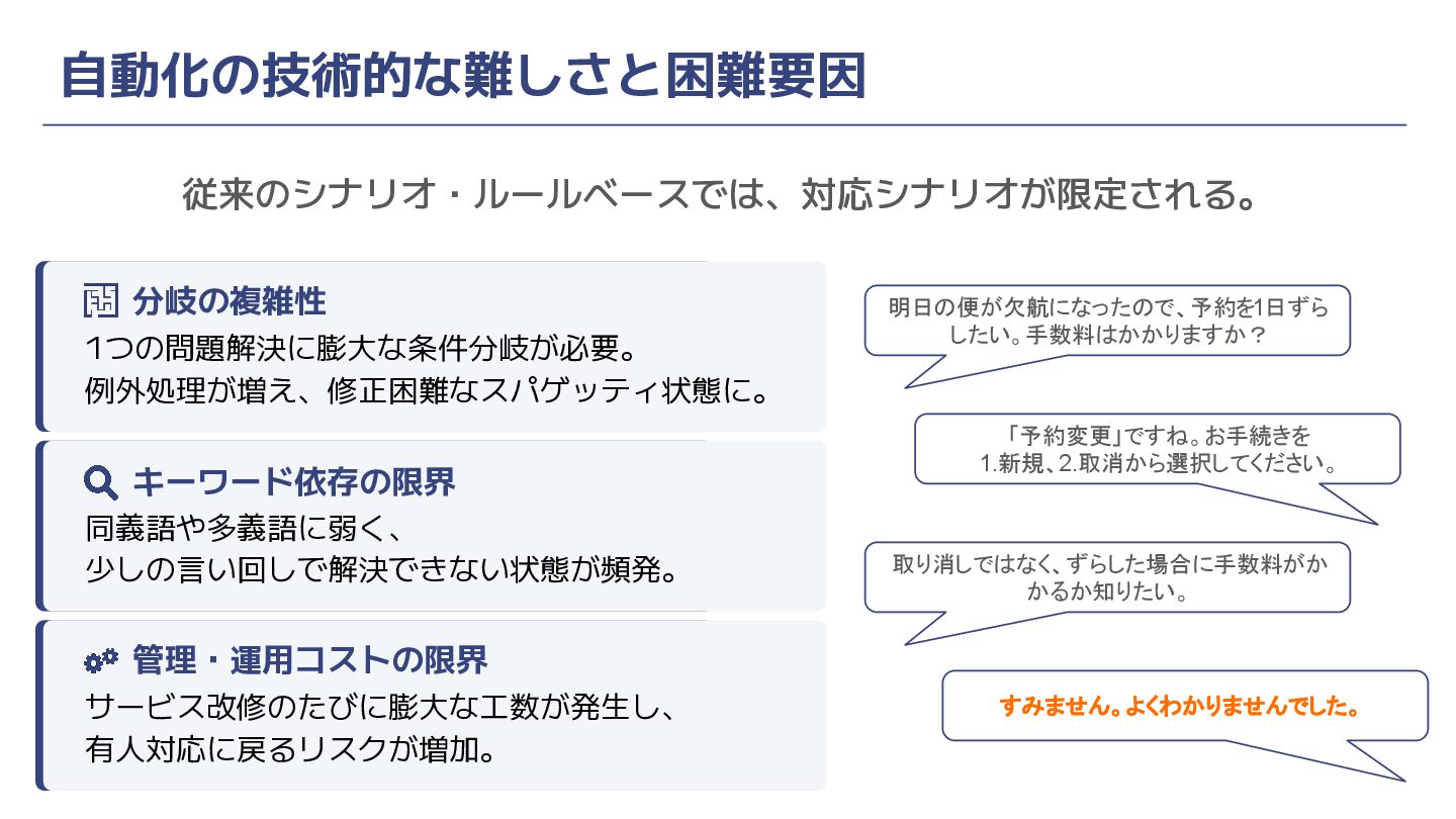 取り消しではなく、ずらした場合に手数料がか かるか知りたい。 自動化の技術的な難しさと困難要因 従来のシナリオ・ルールベースでは、対応シナリオが限定される。 分岐の複雑性 1つの問題解決に膨大な条件分岐が必要。 例外処理が増え、修正困難なスパゲッティ状態に。 キーワード依存の限界 同義語や多義語に弱く、 少しの言い回しで解決できない状態が頻発。