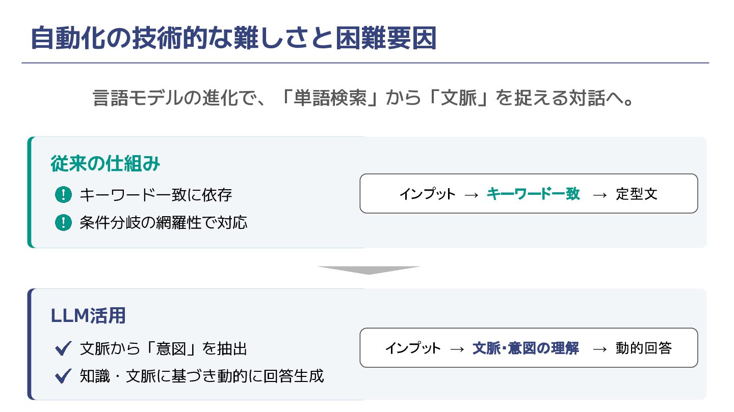 自動化の技術的な難しさと困難要因 言語モデルの進化で、「単語検索」から「文脈」を捉える対話へ。 従来の仕組み LLM活用 文脈から「意図」を抽出 知識・文脈に基づき動的に回答生成 キーワード一致に依存 条件分岐の網羅性で対応 インプット →
