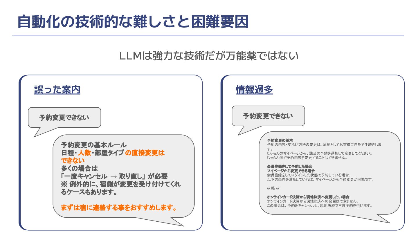 自動化の技術的な難しさと困難要因 LLMは強力な技術だが万能薬ではない 誤った案内 情報過多 予約変更の基本ルール 日程・人数・部屋タイプの直接変更は できない 多くの場合は 「一度キャンセル →