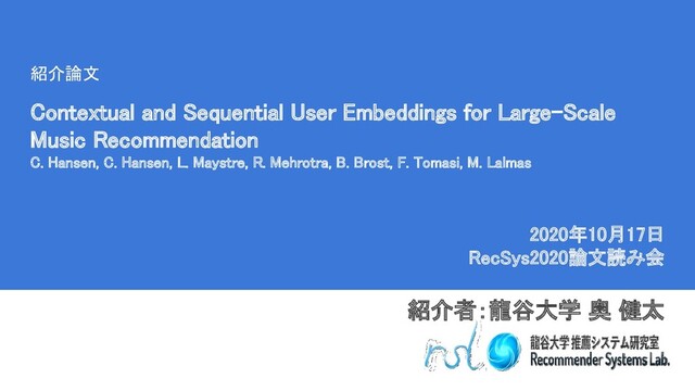 C. Hansen, C. Hansen, L. Maystre, R. Mehrotra, B. Brost, F. Tomasi, M. Lalmas, Contextual and Sequential User Embeddings for Large-Scale Music Recommendation, In Proceedings of the 14th ACM conference on Recommender systems, pp.53-62, 2020.