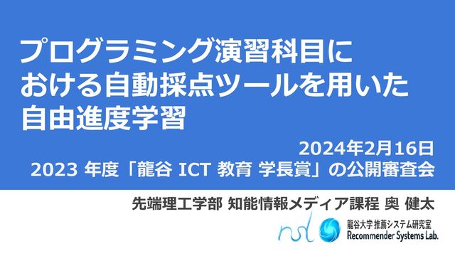プログラミング演習科目に おける自動採点ツールを用いた 自由進度学習 2024年2月16日 2023 年度「龍谷 ICT 教育 学長賞」の公開審査会 先端理工学部