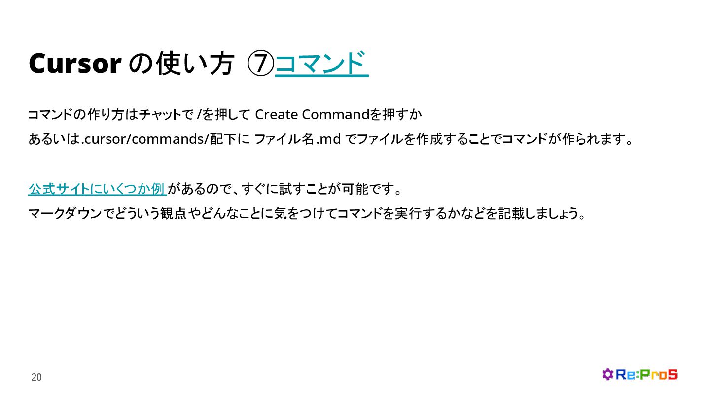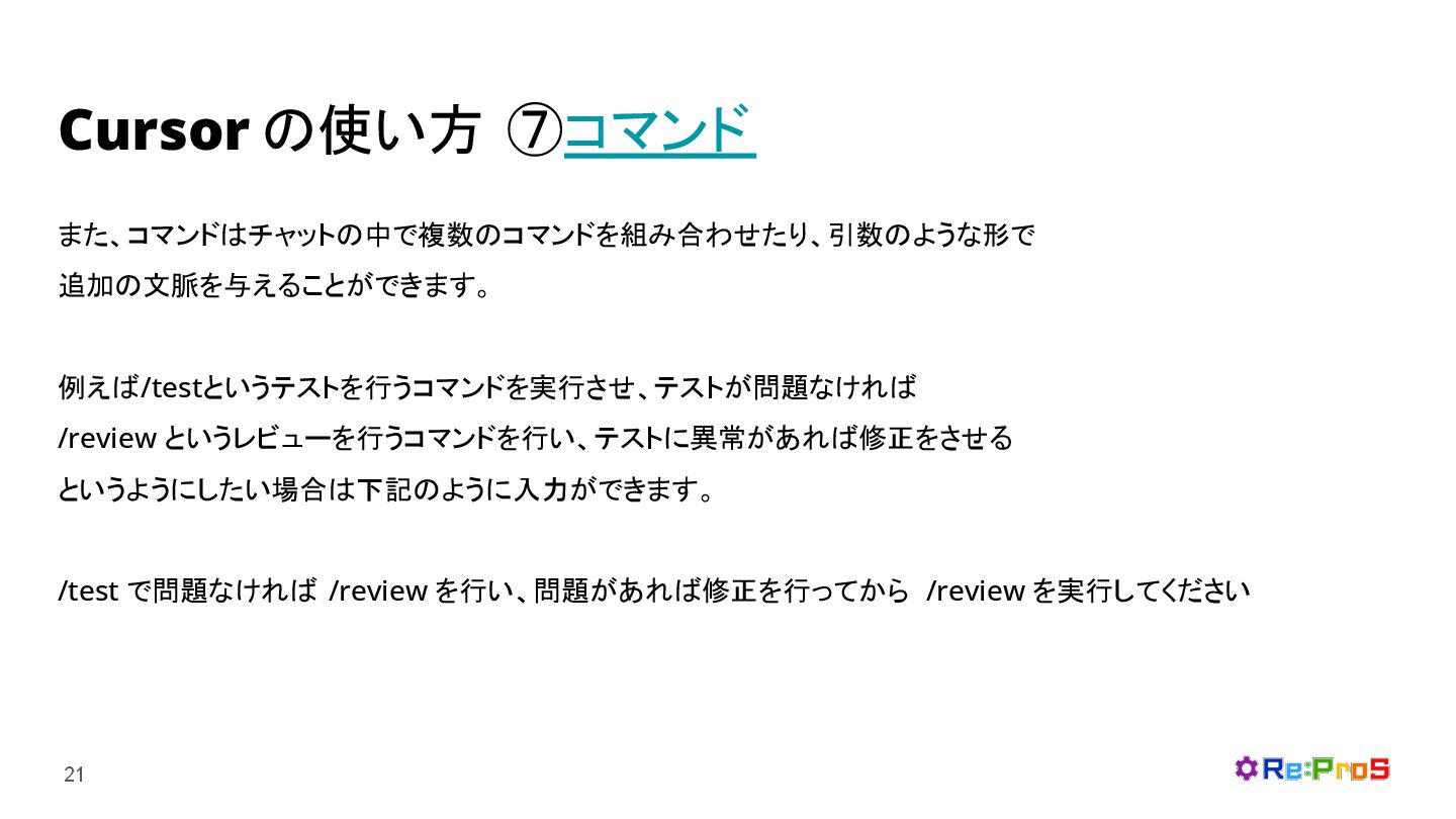 Cursor の使い方 ⑦コマンド 19 自身で定義可能なカスタムコマンドを設定し、作業の効率化を行うことができます。 例えば、事前に決めた手順に沿ってテストの実行を行わせたり、コードレビューを行わせたりできます。 (下記は/review でレビューを行うように設定した時の例 )