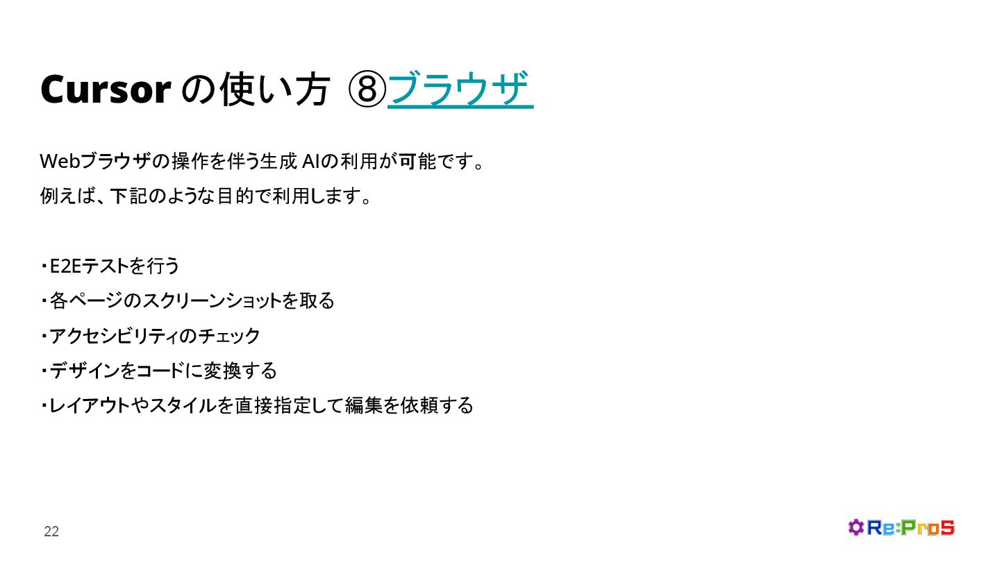 Cursor の使い方 ⑧ブラウザ 22 Webブラウザの操作を伴う生成 AIの利用が可能です。 例えば、下記のような目的で利用します。 ・E2Eテストを行う ・各ページのスクリーンショットを取る ・アクセシビリティのチェック