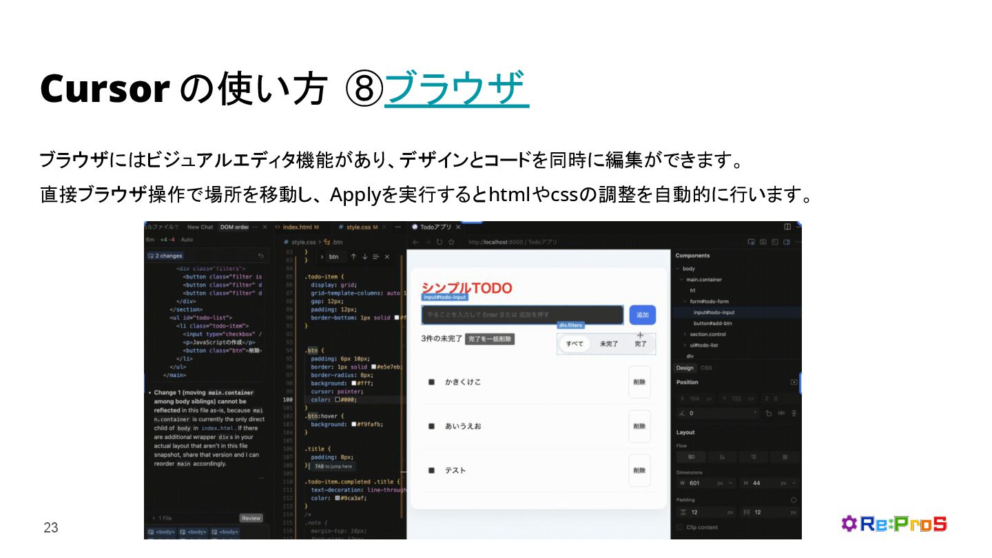 Cursor の使い方 ⑧ブラウザ 23 ブラウザにはビジュアルエディタ機能があり、デザインとコードを同時に編集ができます。 直接ブラウザ操作で場所を移動し、 Applyを実行するとhtmlやcssの調整を自動的に行います。