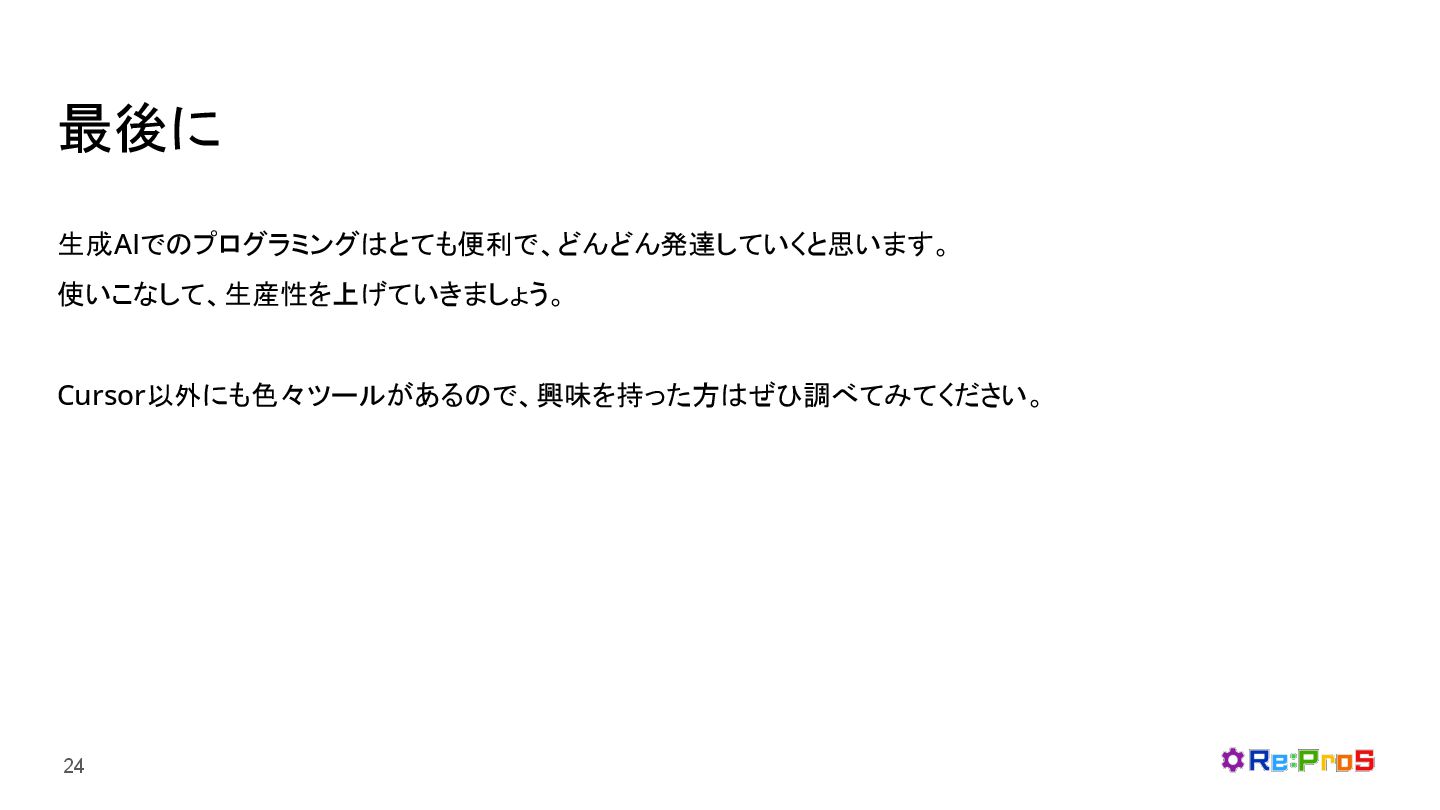 最後に 24 生成AIでのプログラミングはとても便利で、どんどん発達していくと思います。 使いこなして、生産性を上げていきましょう。 Cursor以外にも色々ツールがあるので、興味を持った方はぜひ調べてみてください。