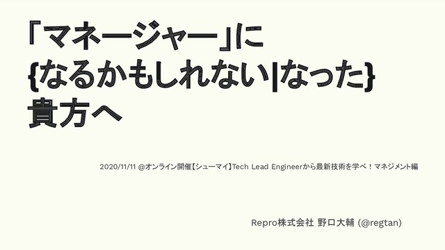 「マネージャー」に {なるかもしれない|なった} 貴方へ 2020/11/11 @オンライン開催【シューマイ】Tech Lead Engineerから最新技術を学べ!マネジメント編 Repro株式会社 野口大輔 (@regtan)