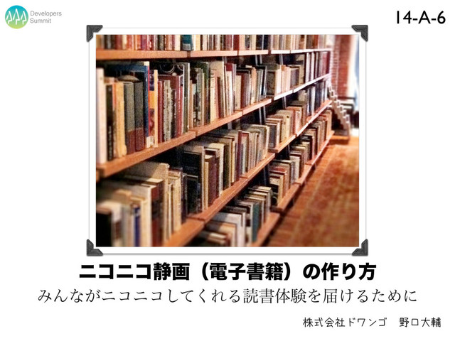 Summit Developers χίχί੩ըʢిࢠॻ੶ʣͷ࡞Γํ ΈΜͳ͕χίχίͯ͘͠ΕΔಡॻମݧΛಧ͚ΔͨΊʹ 14-A-6 株式会社ドワンゴ 野口大輔
