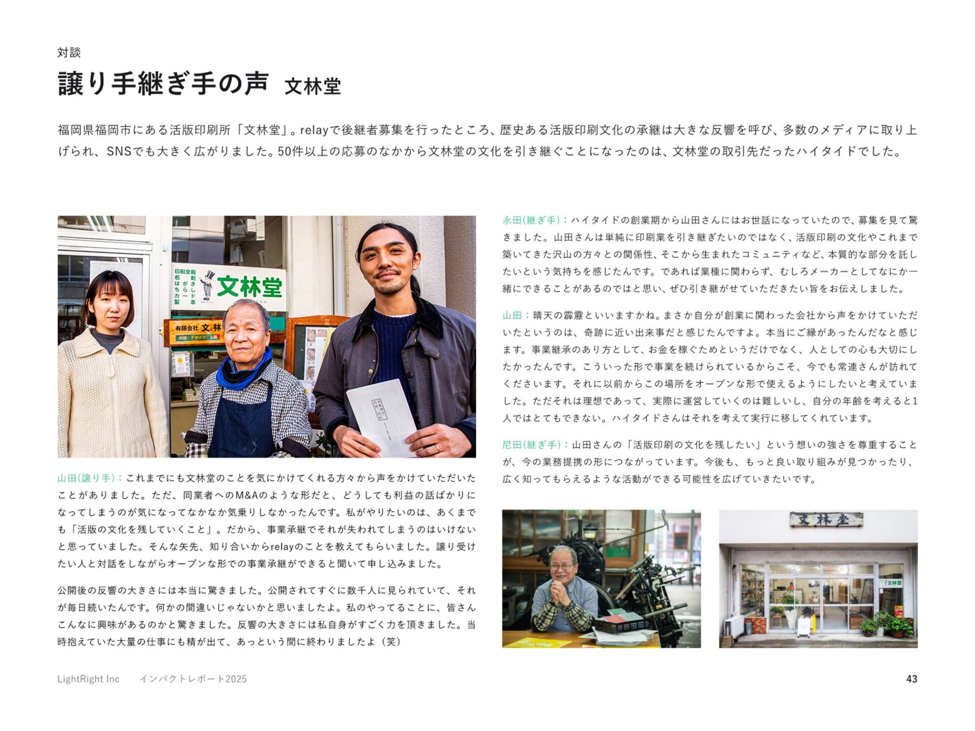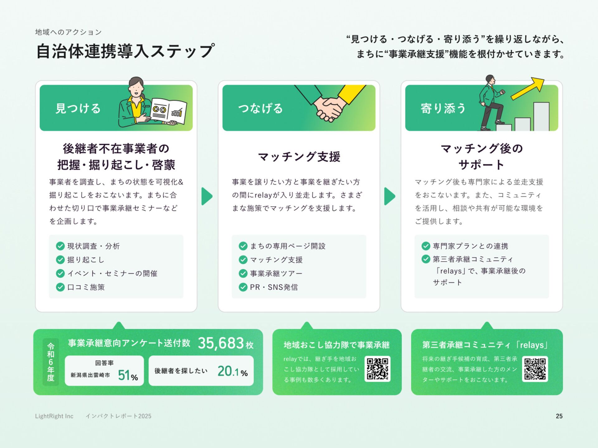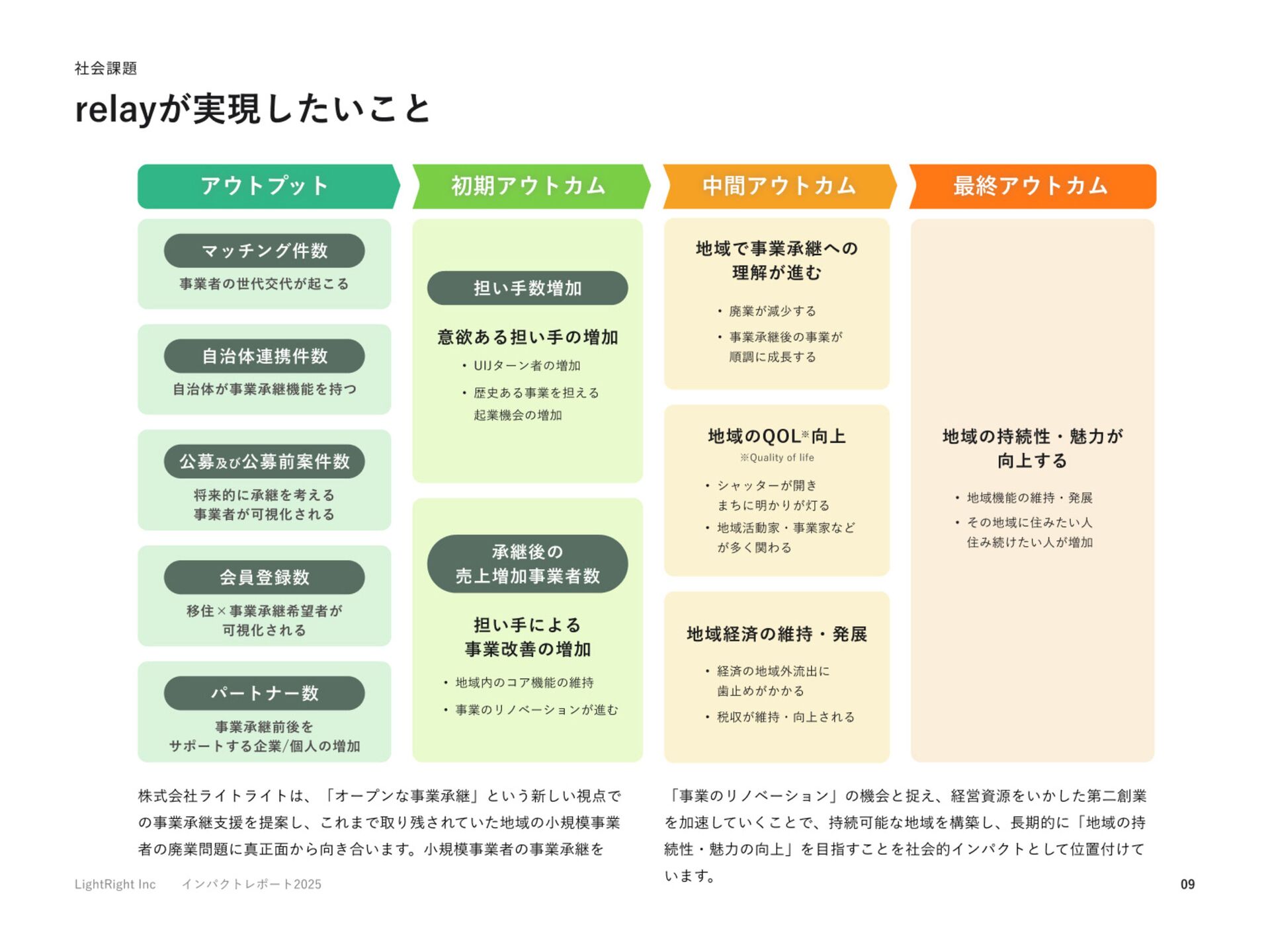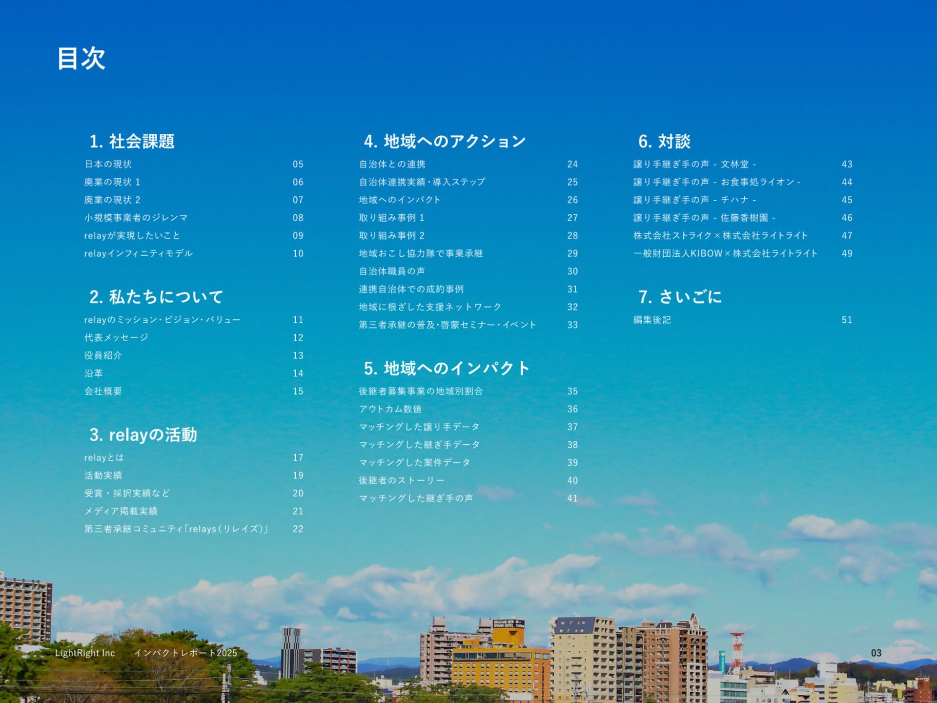 事業承継が地域にもたらす効果を定量・定性の指標でまとめた「relay インパクトレポート2025 〜事業承継のあるまちが描く、持続可能な未来〜」を全ページ公開いたします。